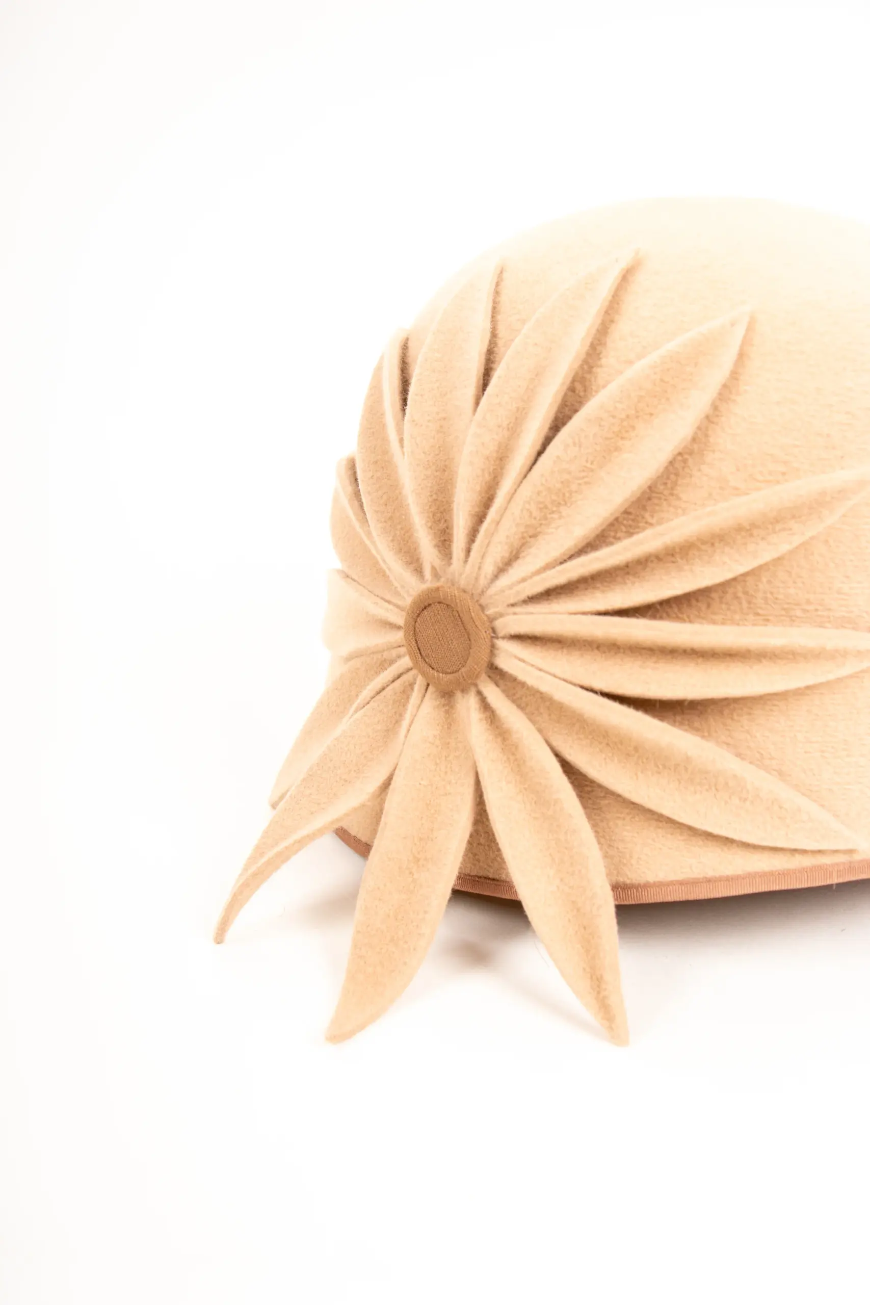 Aus unserer eigenen Werkstatt stammt diese wunderschöne Glocke Atelier Falkenhagen Nele Velours. Dieser Damenhut wird tief ins Gesicht getragen. Der Filzhut im Stil der 20er Jahre überzeugt durch seinen komfortablen Sitz. Der Rand verfügt über einen Einfass, wenn Sie möchten. Als Garnitur sitzt seitlich rechts eine große Blume aus Filz, welche Ihr Gesicht umschmeichelt. Die kleine Cloche liegt sehr eng an und ist eher als Kappe zu bezeichnen. Gut geeignet für zarte, zierliche Köpfe.