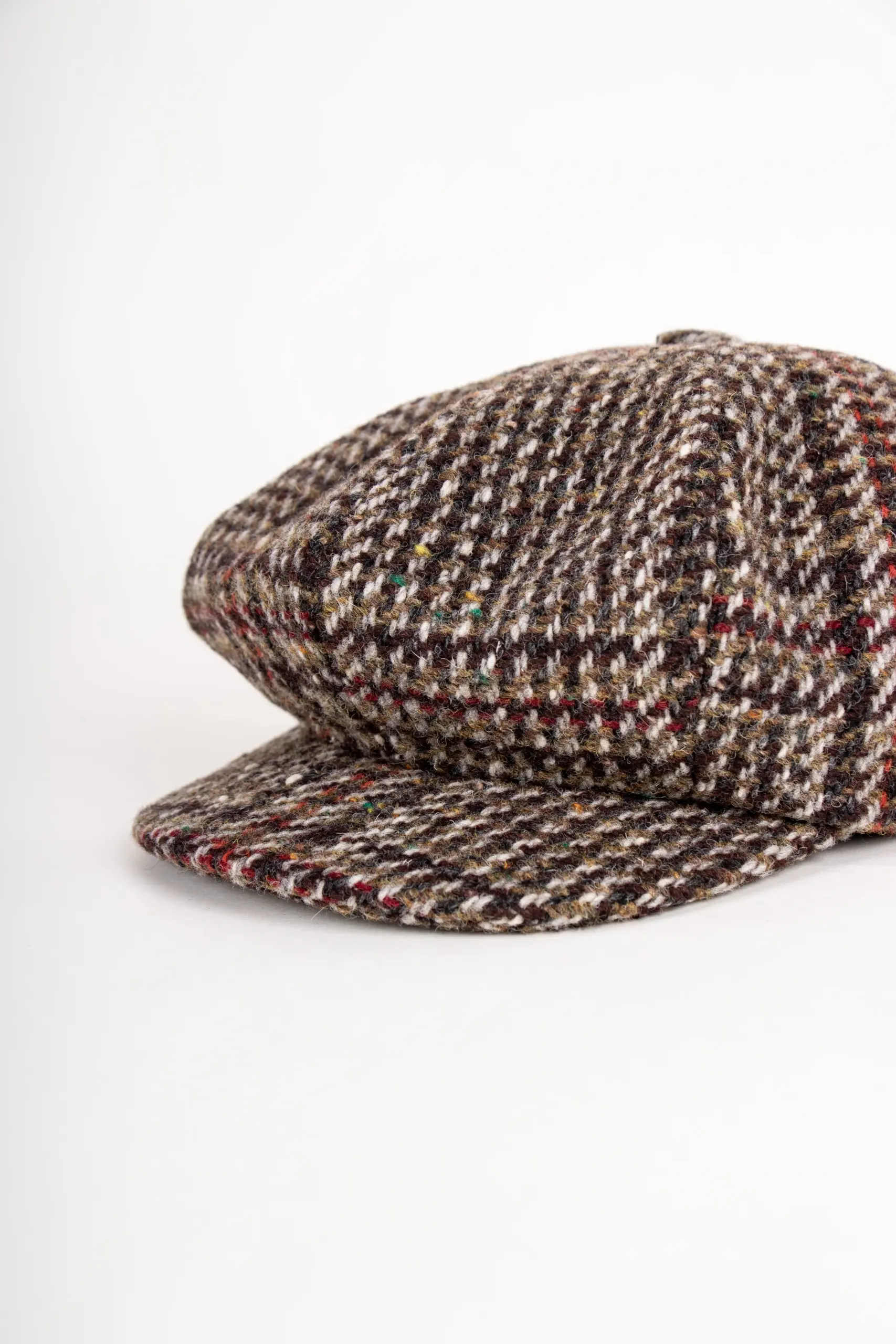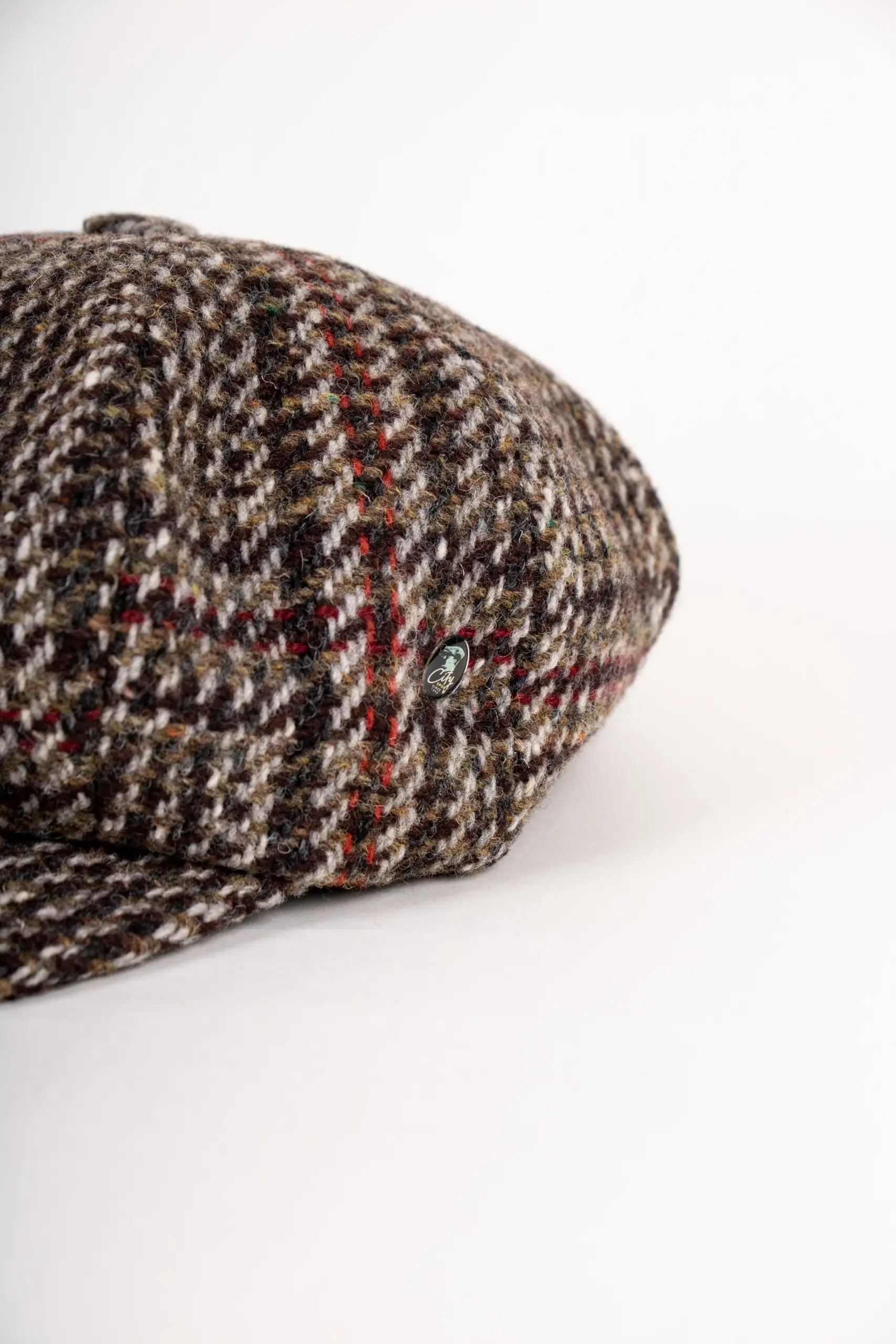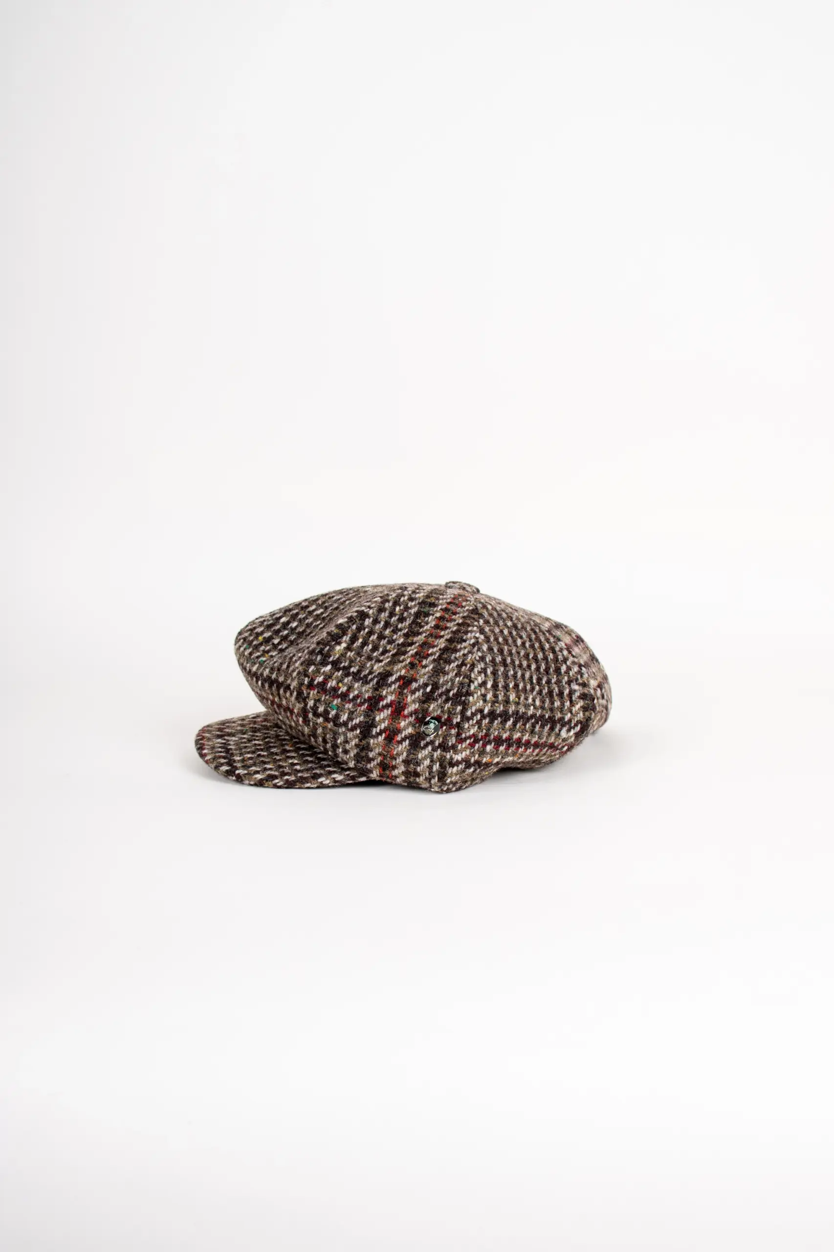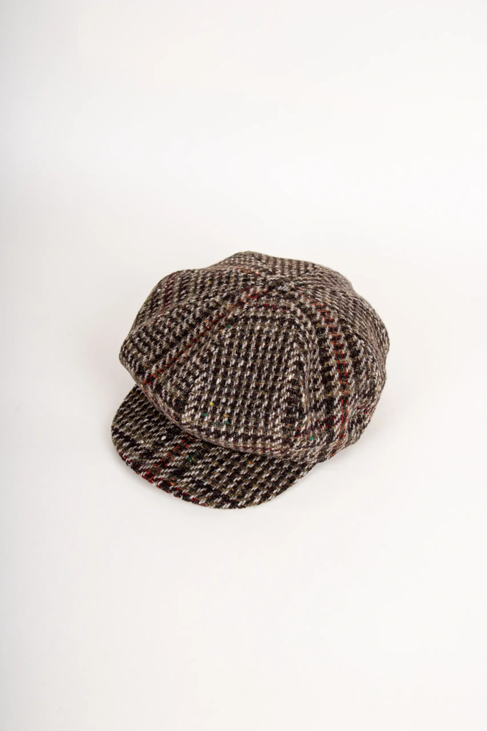 Material: 100% Wolle Futter: 100% Baumwolle Farbe: Braun-Oliv-Beige-Terracotta gewebt Schirmlänge: ca. 6 cm Form: Ballonmütze, 8-teilig