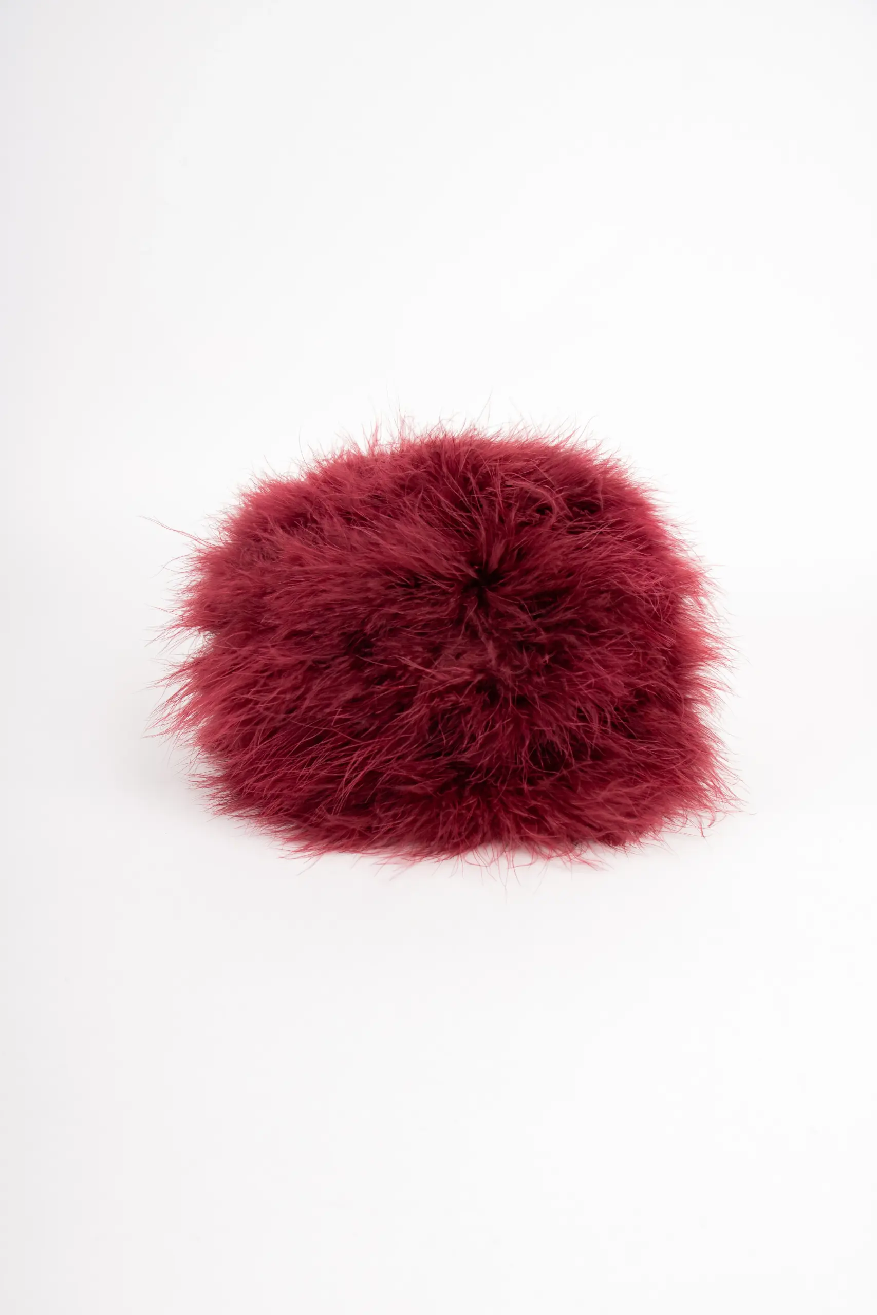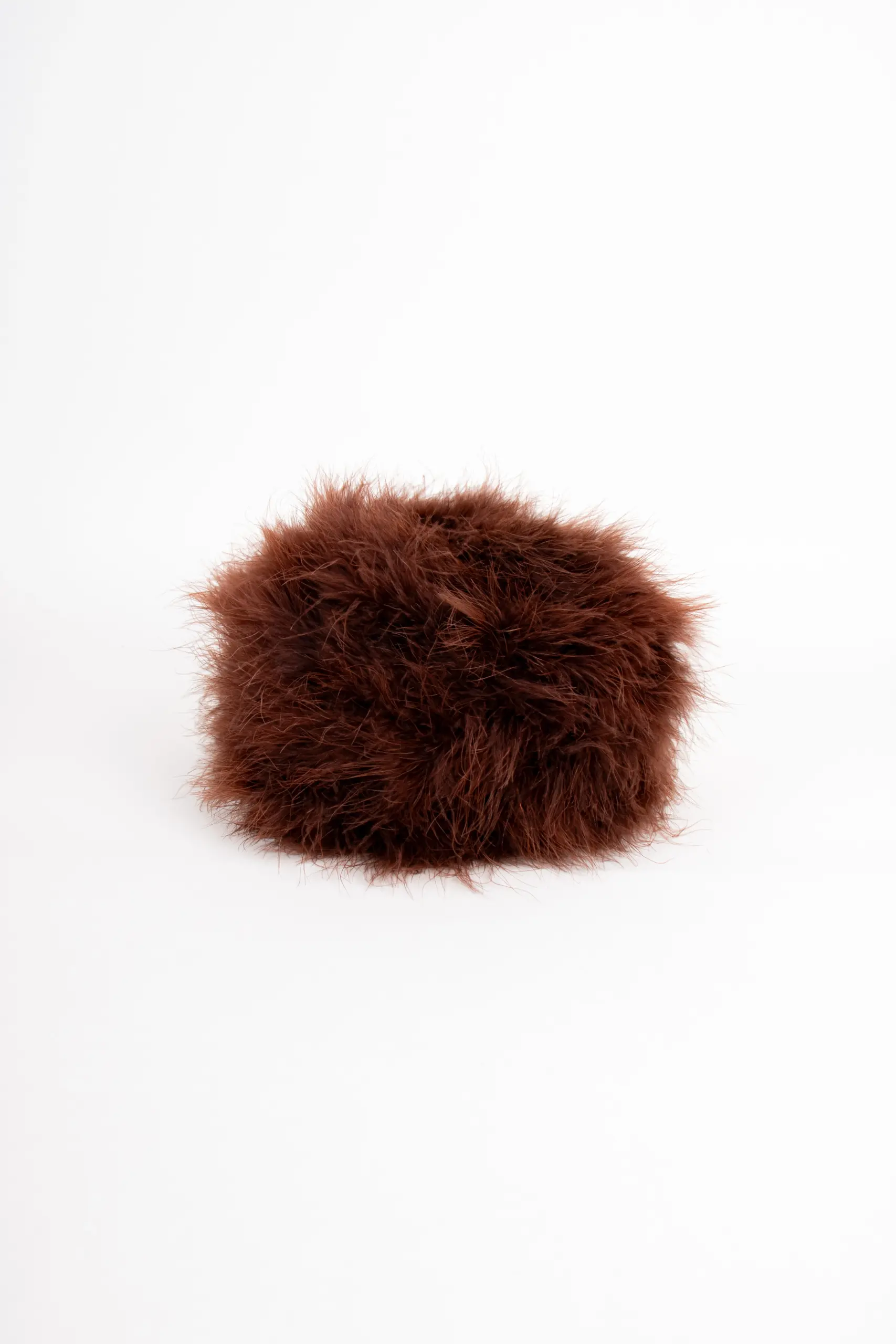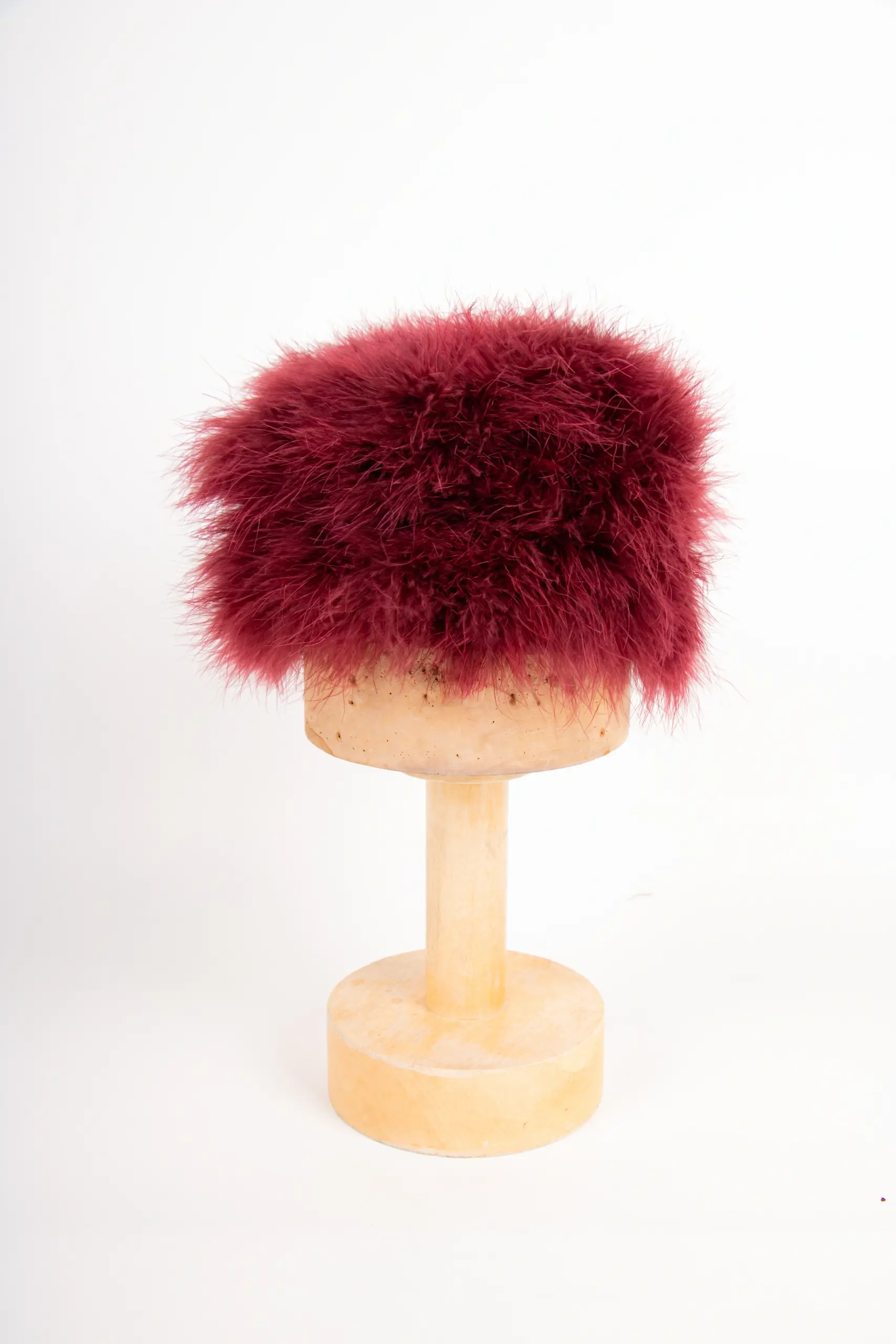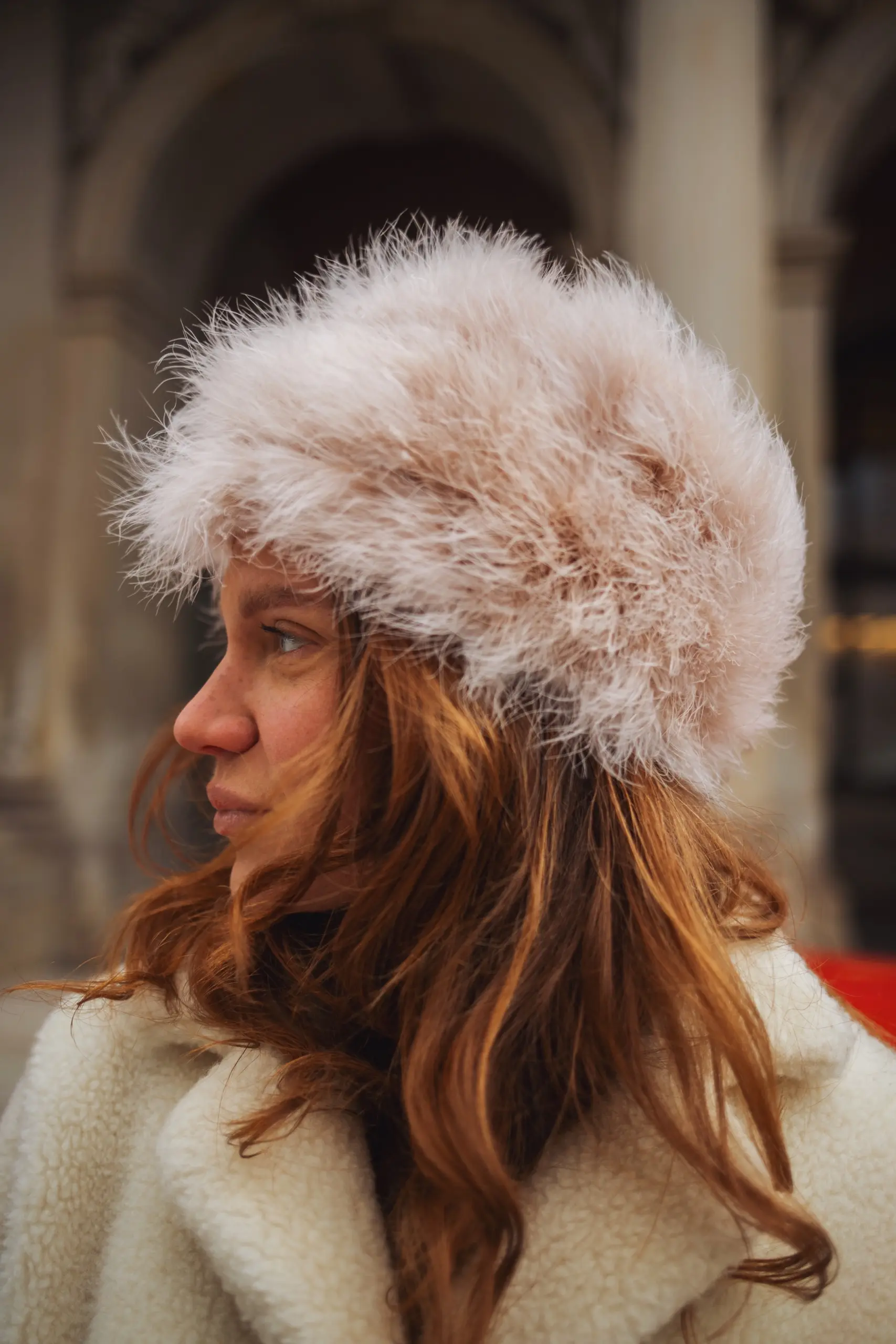 Feder für Feder von Hand gesetzt, entstand eine Toque, die laut ist und auffällt. Die zarten Truthahnfedern bewegen sich mit jeder Geste, fast wie ein leiser Flügelschlag – ein Hauch Couture, getragen mit Gelassenheit.