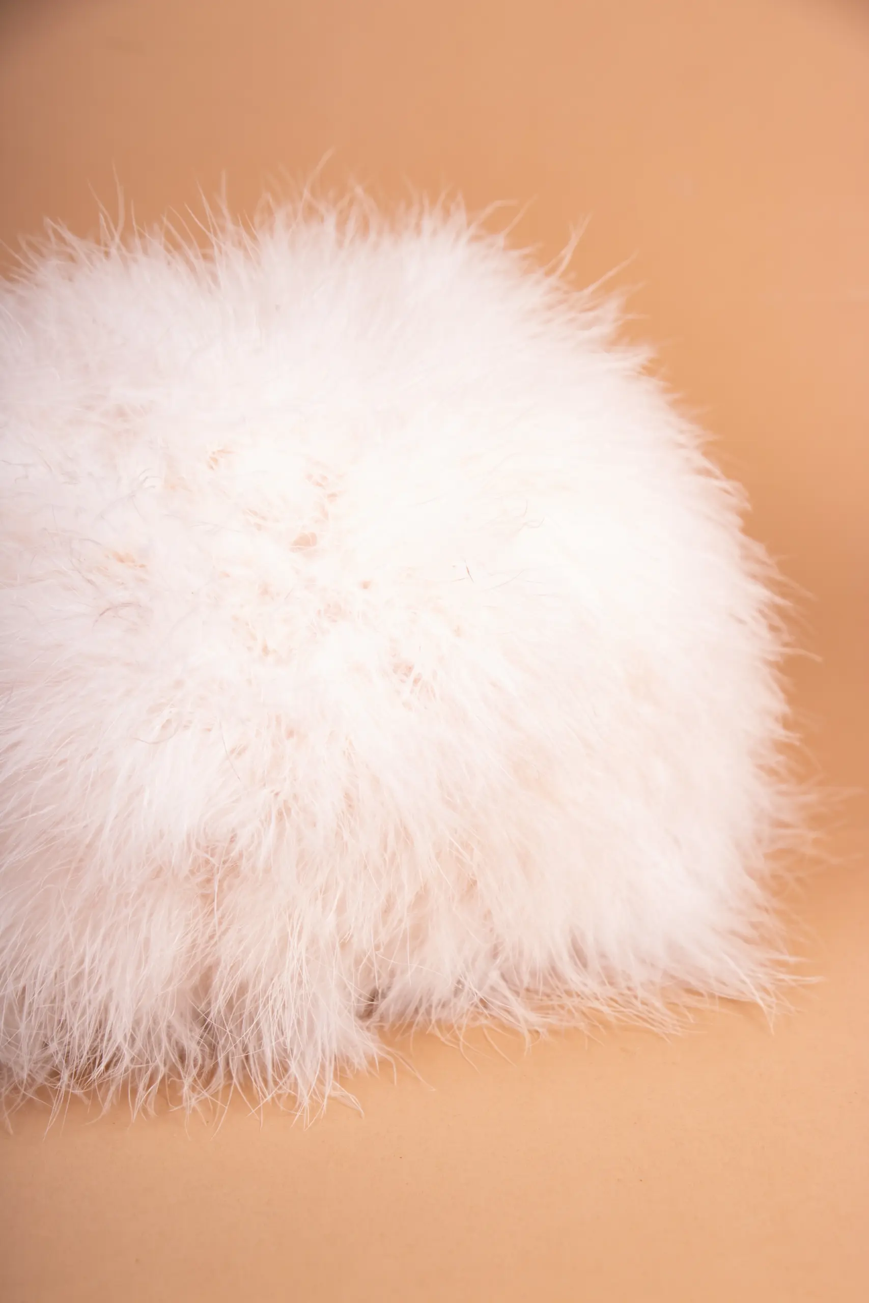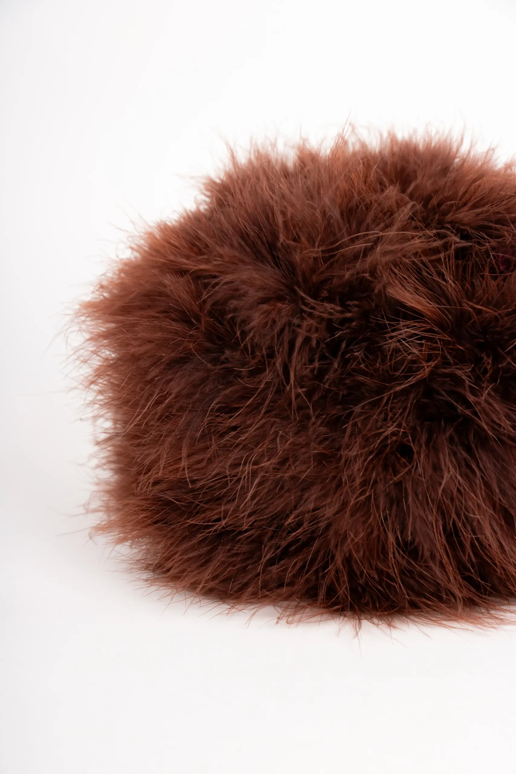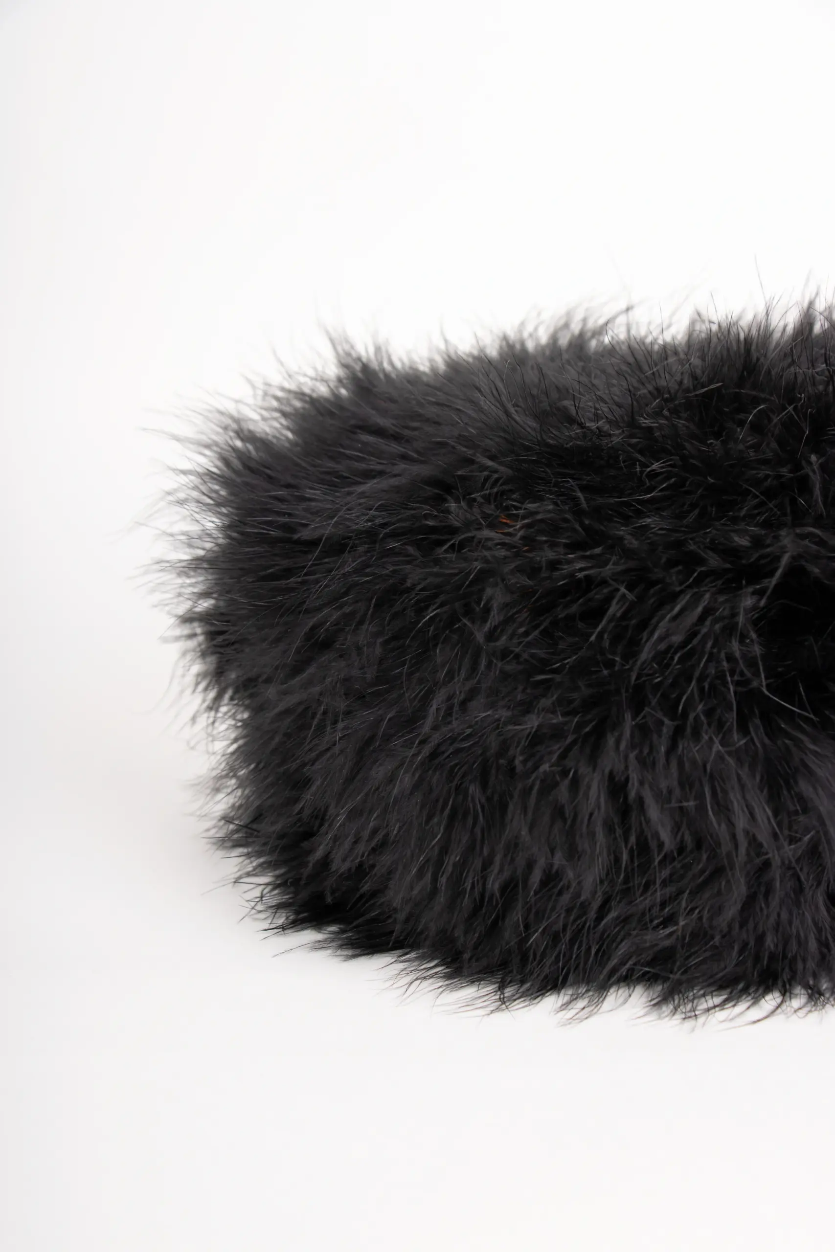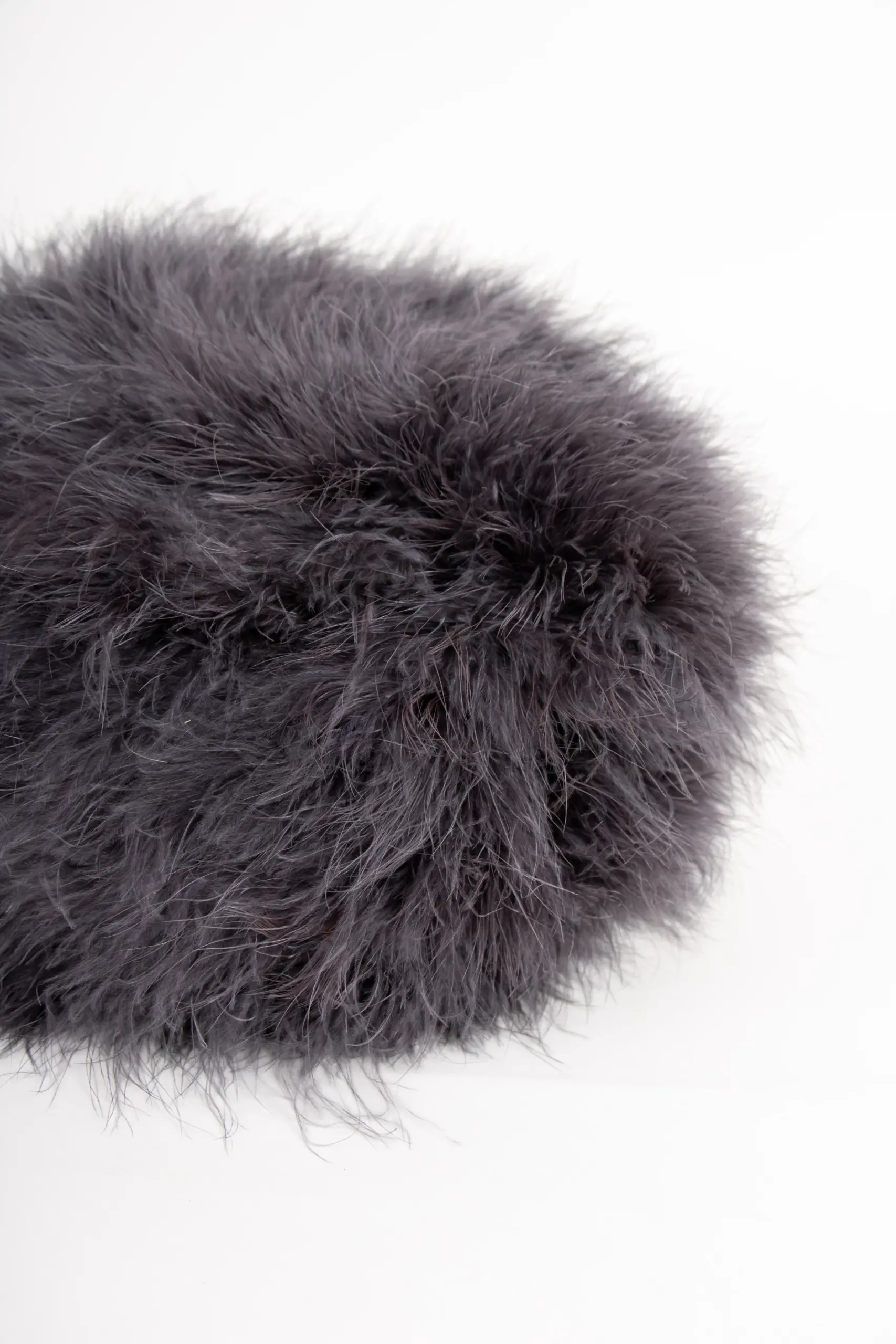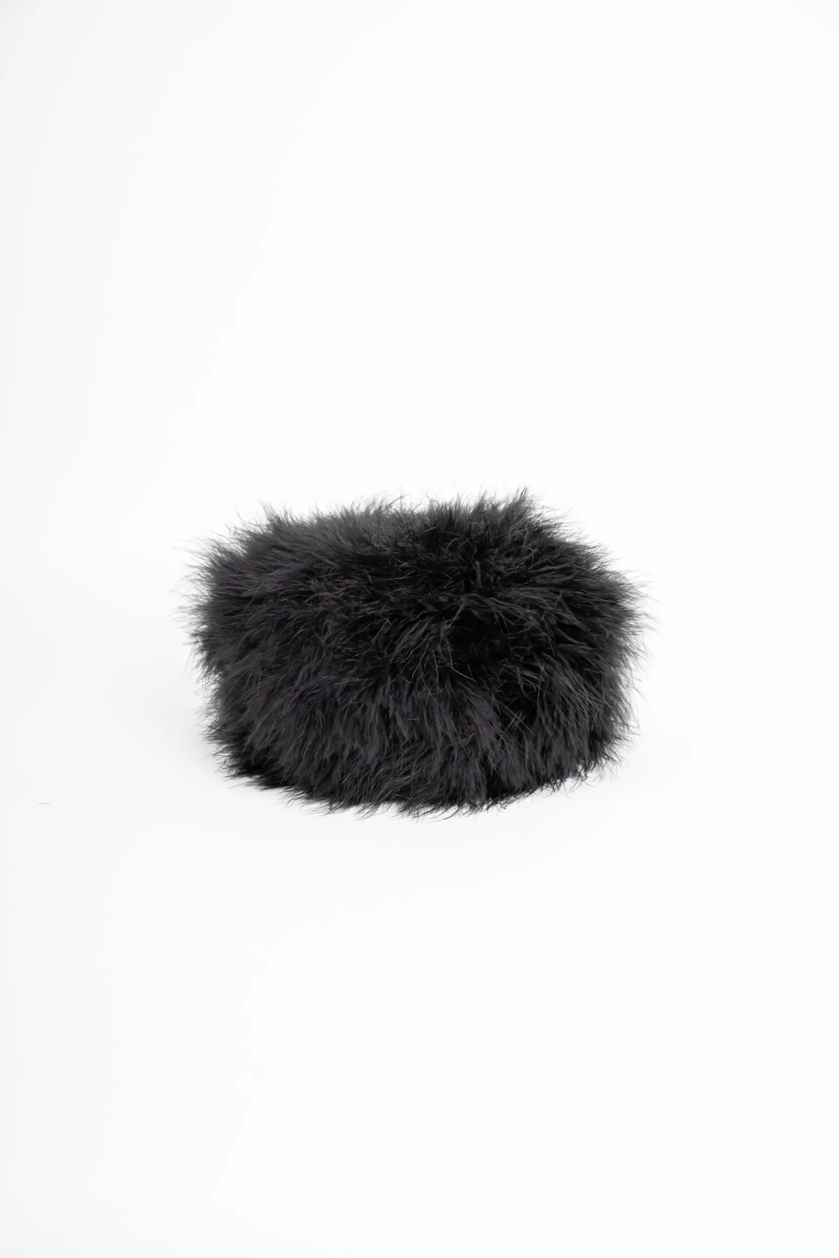 Feder für Feder von Hand gesetzt, entstand eine Toque, die laut ist und auffällt. Die zarten Truthahnfedern bewegen sich mit jeder Geste, fast wie ein leiser Flügelschlag – ein Hauch Couture, getragen mit Gelassenheit.