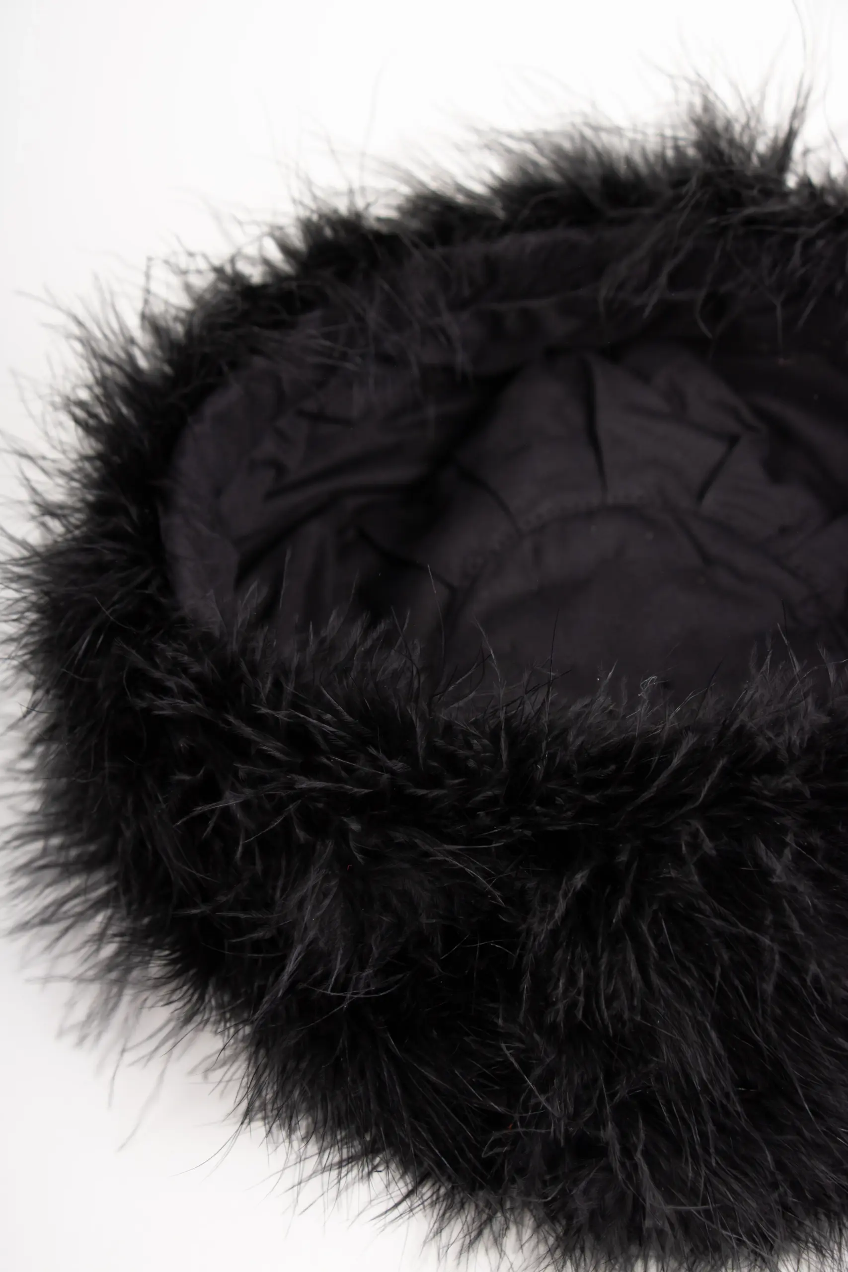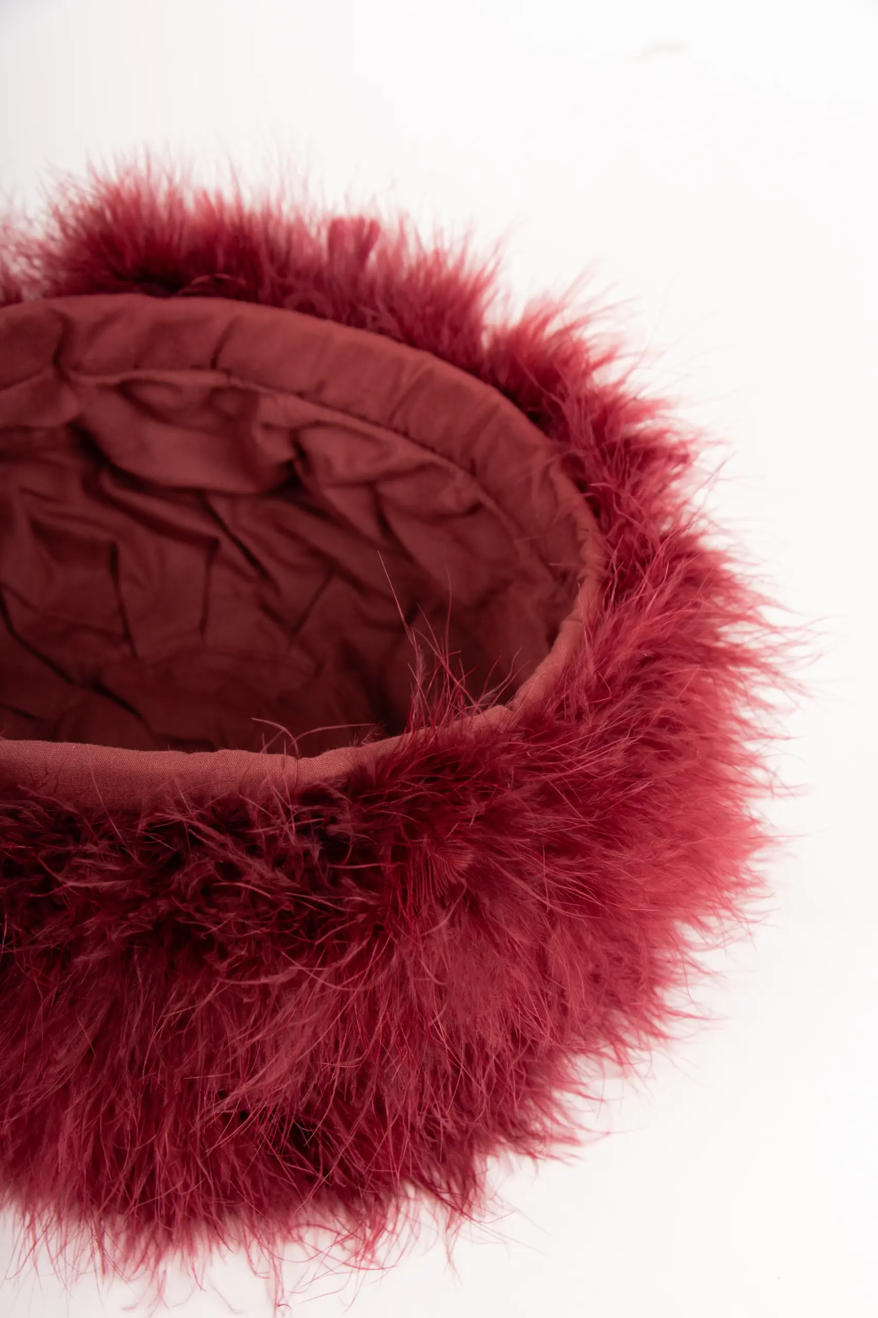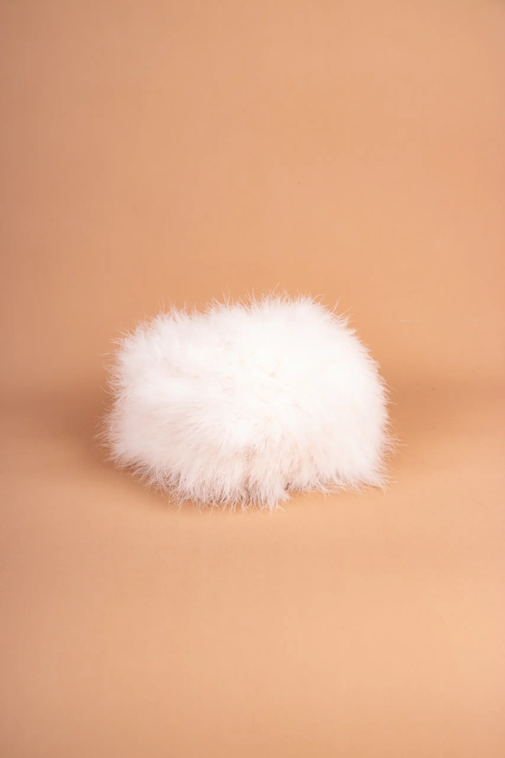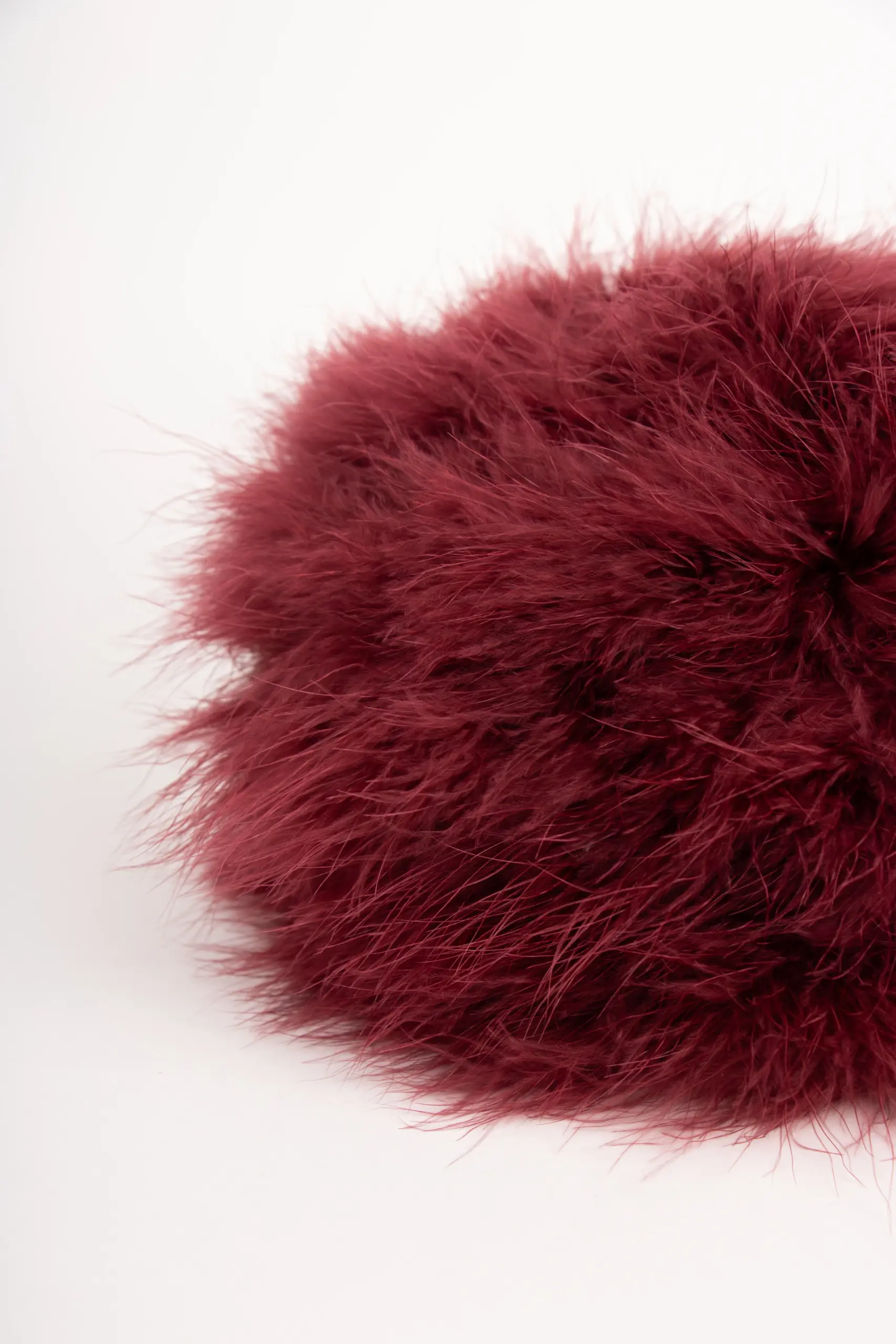 Feder für Feder von Hand gesetzt, entstand eine Toque, die laut ist und auffällt. Die zarten Truthahnfedern bewegen sich mit jeder Geste, fast wie ein leiser Flügelschlag – ein Hauch Couture, getragen mit Gelassenheit.