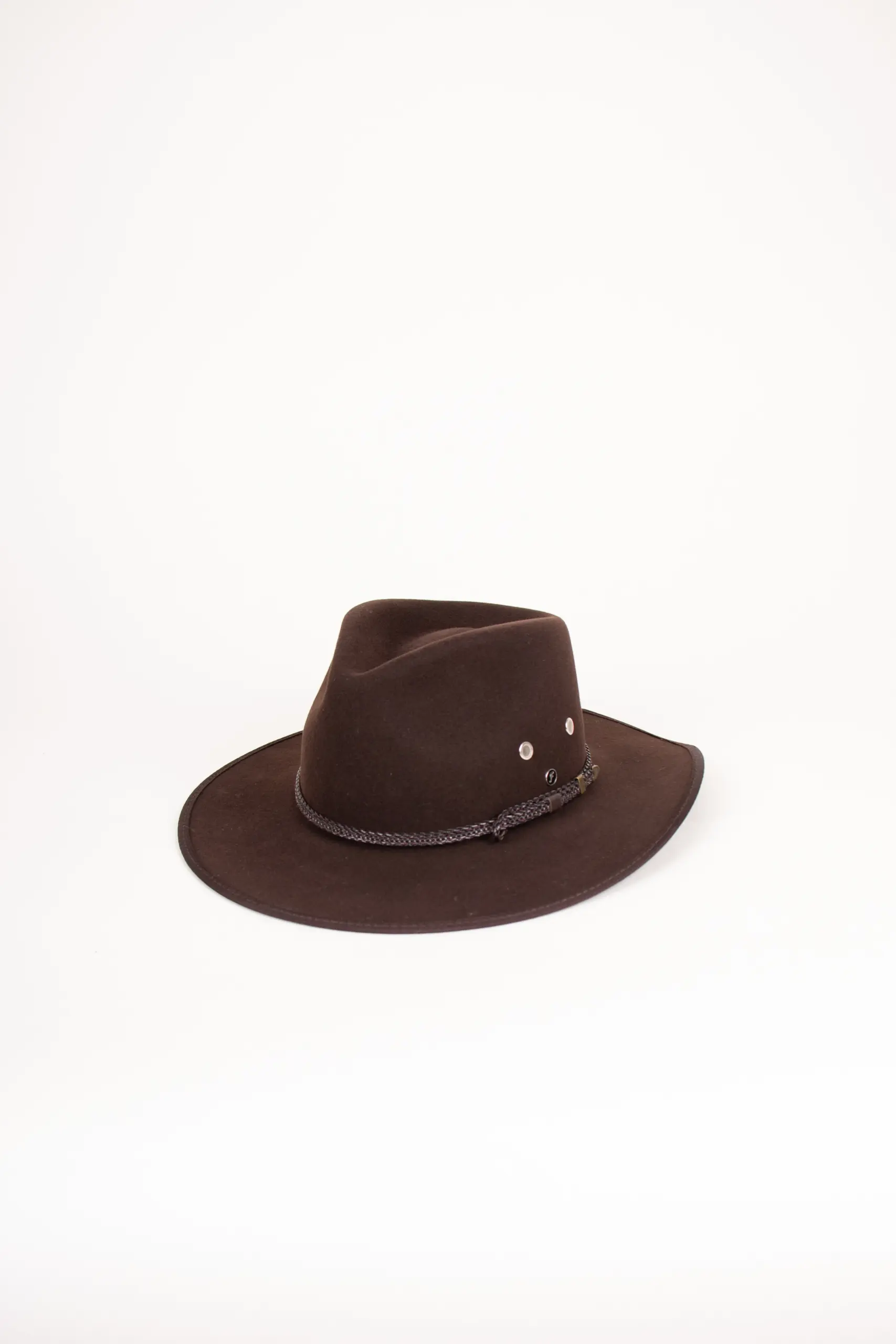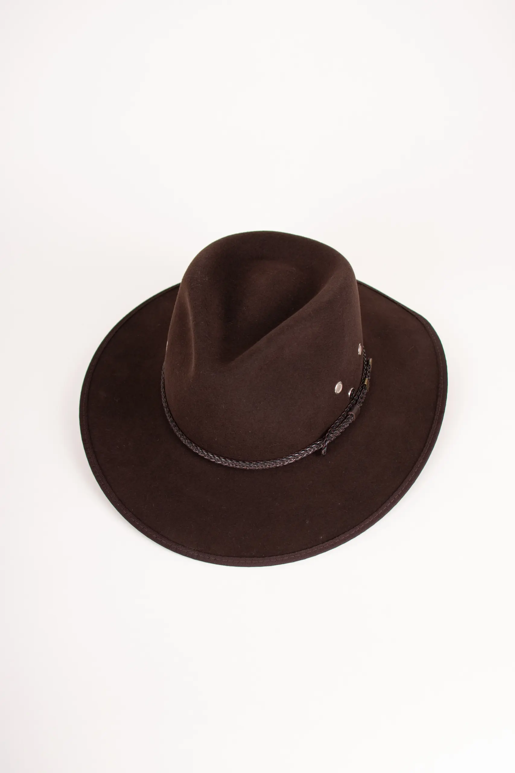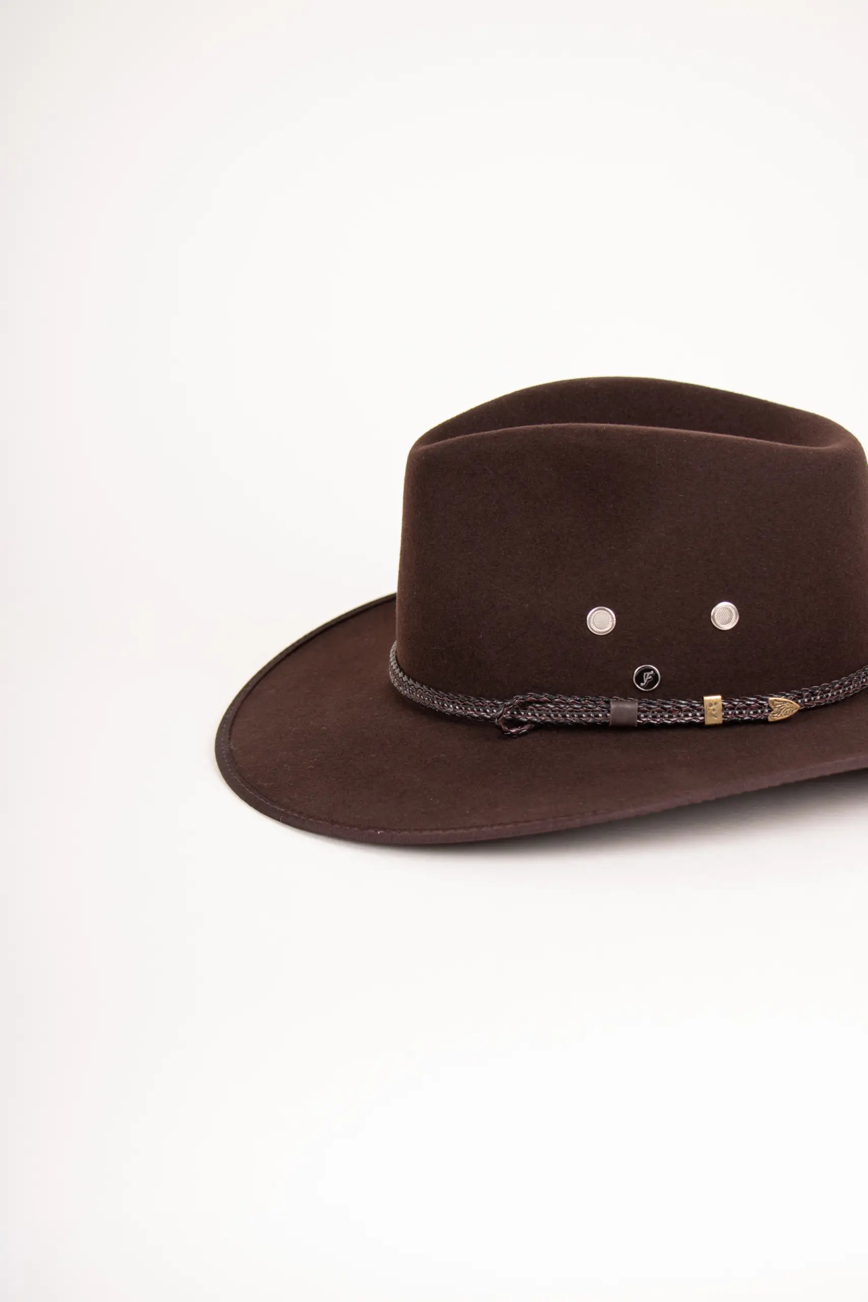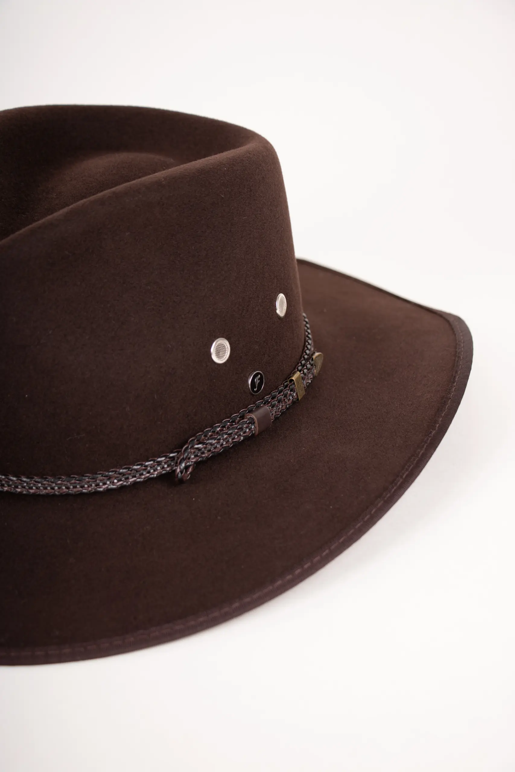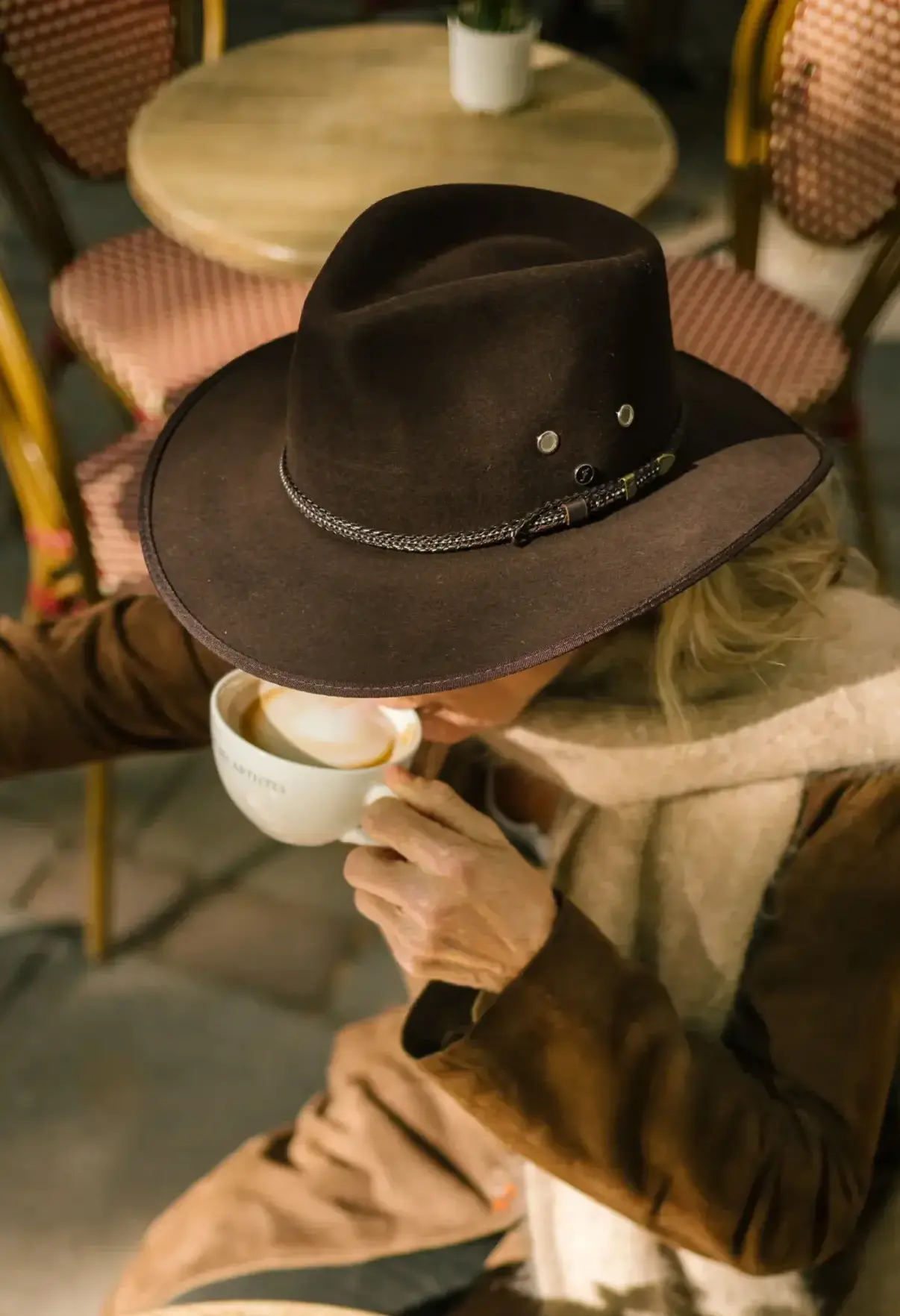 Gefertigt aus besonders weicher, hochwertiger Wollqualität, überzeugt dieser Traveller durch seine elegante Anmutung und seine praktischen Eigenschaften: waterproof und crushable, behält er stets seine Form – ob auf Reisen, im Alltag oder beim Stadtbummel. Die Krempe fällt wie für einen Traveller gewöhnlich vorne und hinten leicht ab.