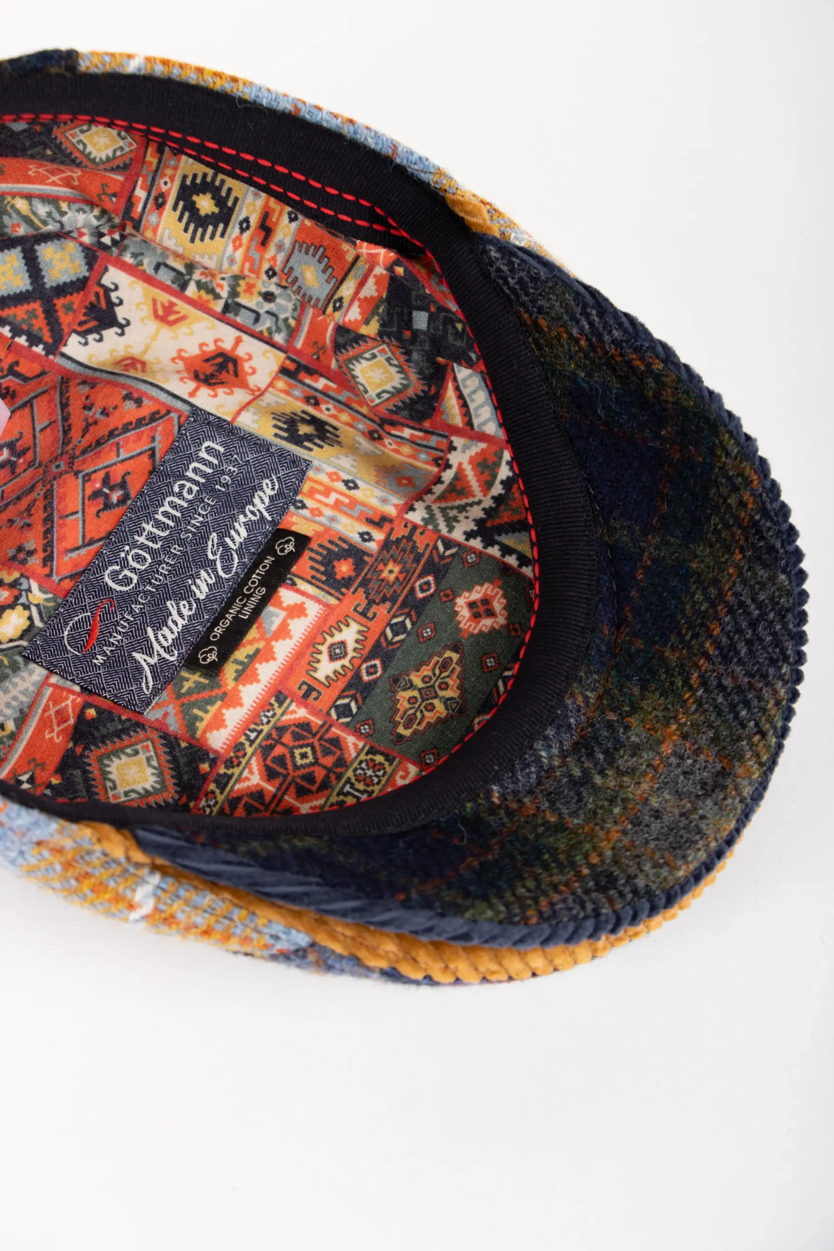 Dazu kommt ein bunt gemustertes Innenleben aus Baumwolle, das zeigt: Diese Mütze ist wild – aber nie laut. Ungewöhnlich, vielschichtig und garantiert nicht langweilig. Eine Schiebermütze, die den grauen Tagen einen Schritt voraus ist.
