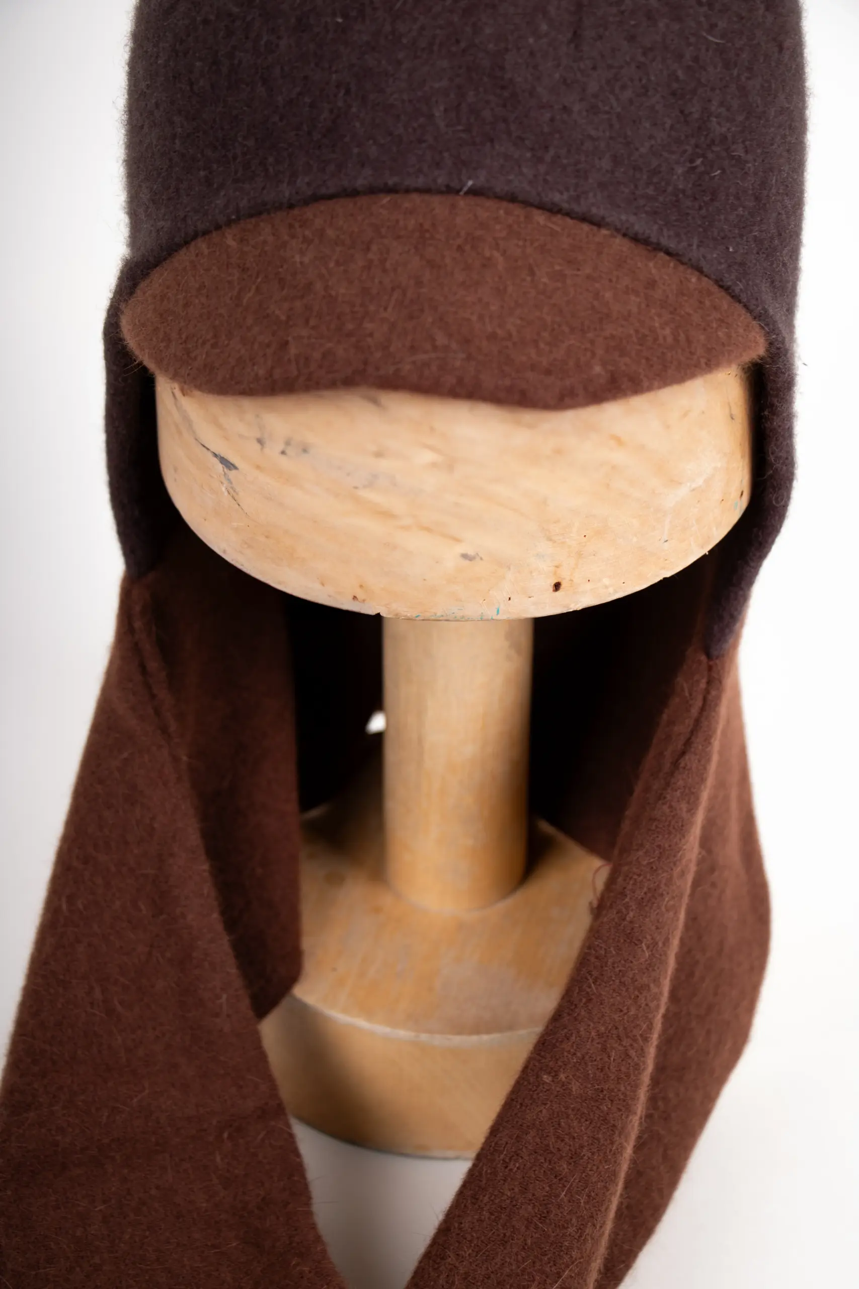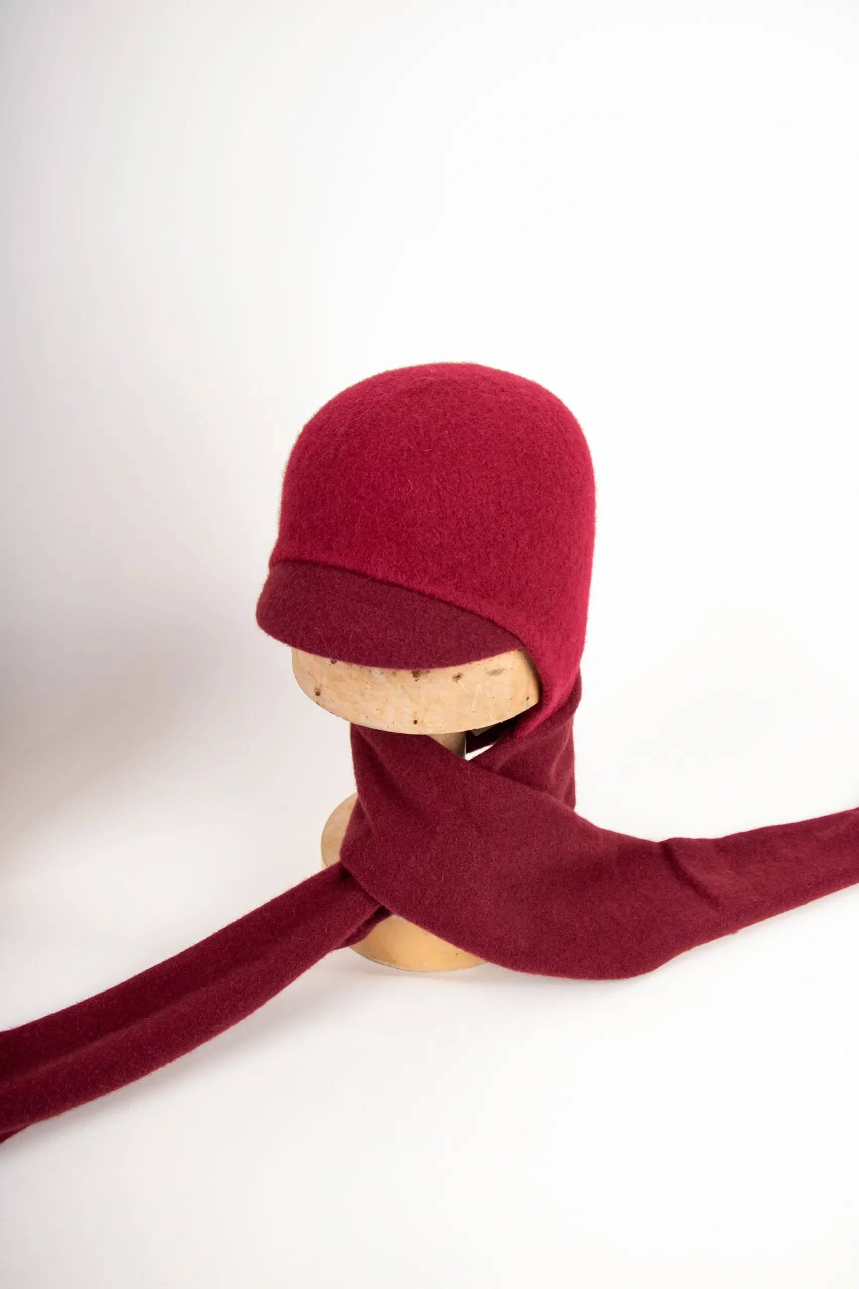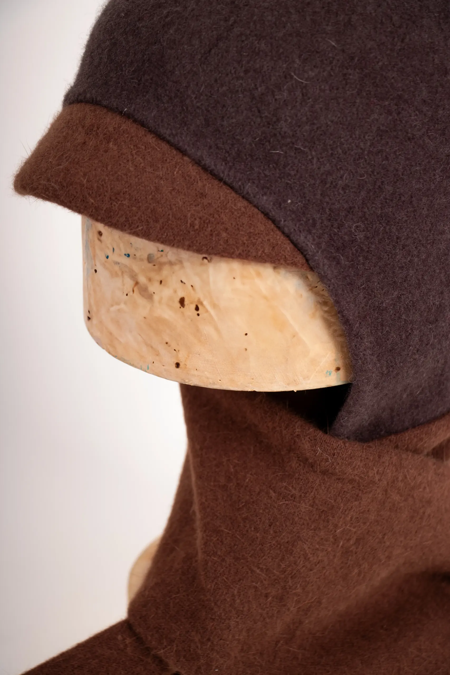 Der integrierte Schal schafft eine elegante, balaclava-ähnliche Silhouette, die Wärme und Stil verbindet. Der weiche Strickstoff legt sich angenehm um Kopf und Hals, während der Filzschirm für Struktur und Charakter sorgt.