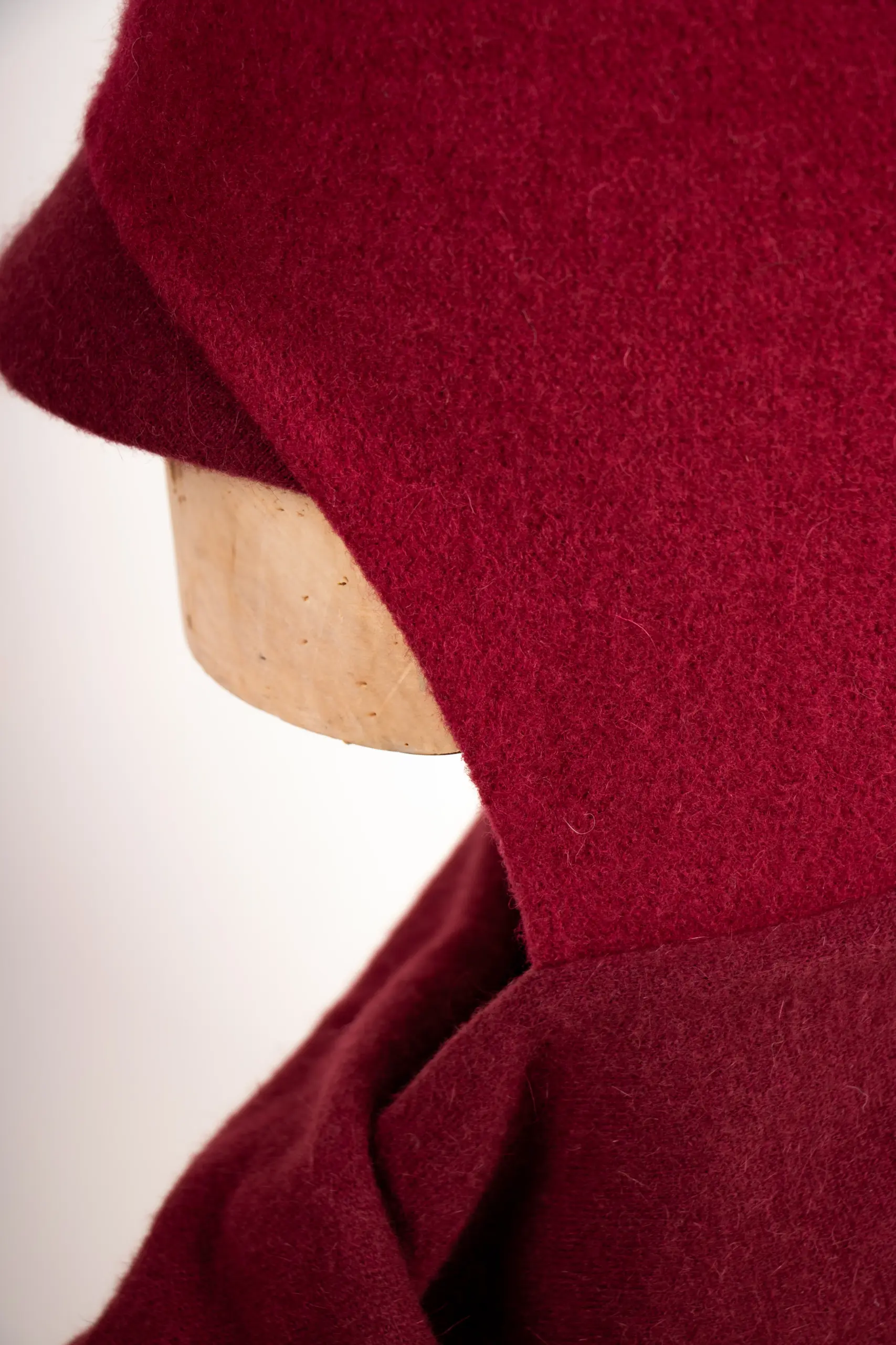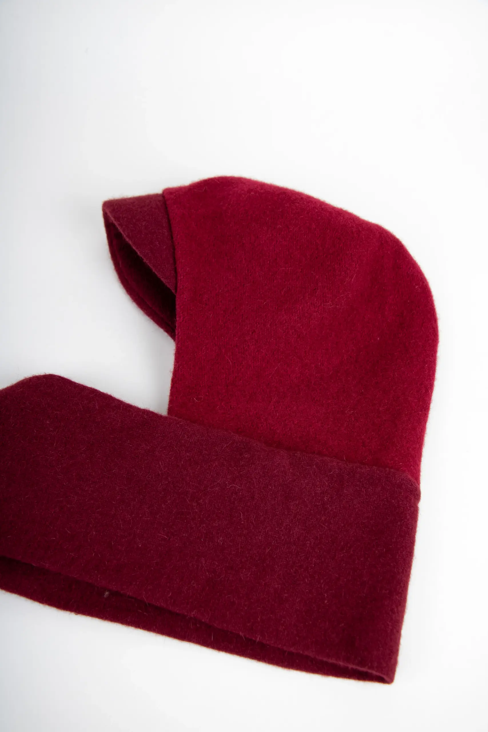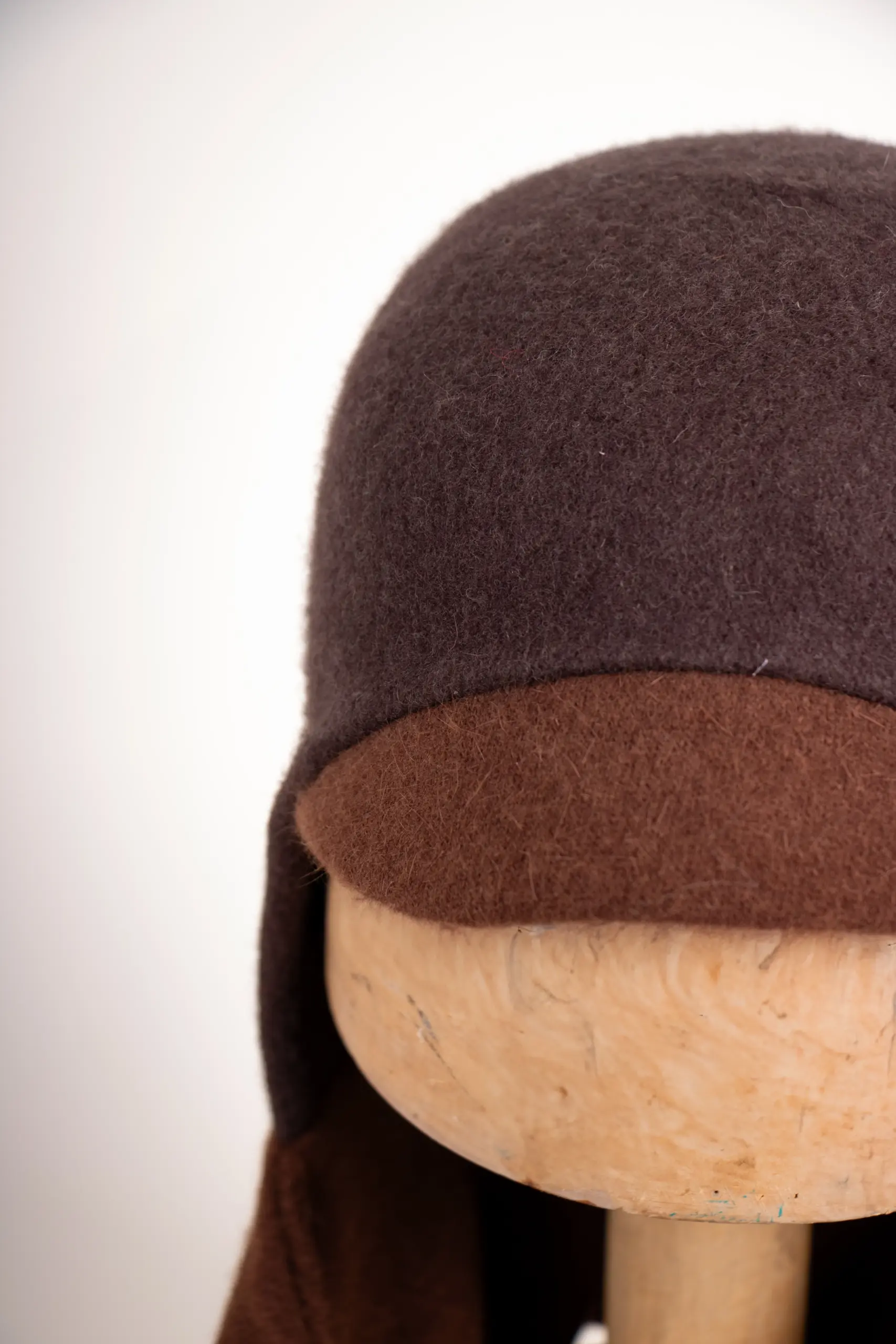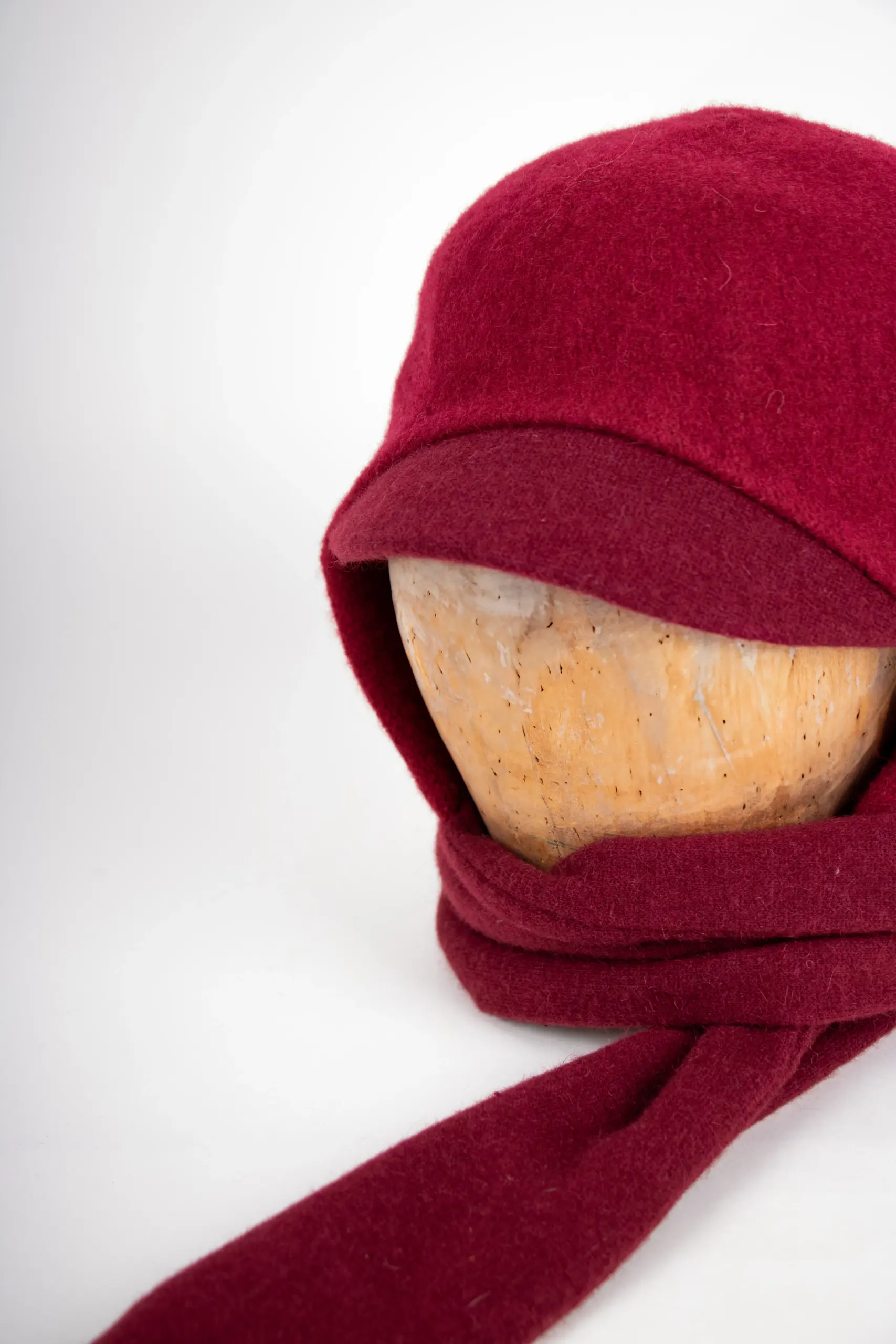 Der integrierte Schal schafft eine elegante, balaclava-ähnliche Silhouette, die Wärme und Stil verbindet. Der weiche Strickstoff legt sich angenehm um Kopf und Hals, während der Filzschirm für Struktur und Charakter sorgt.