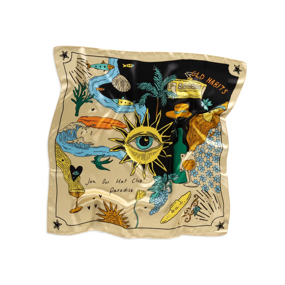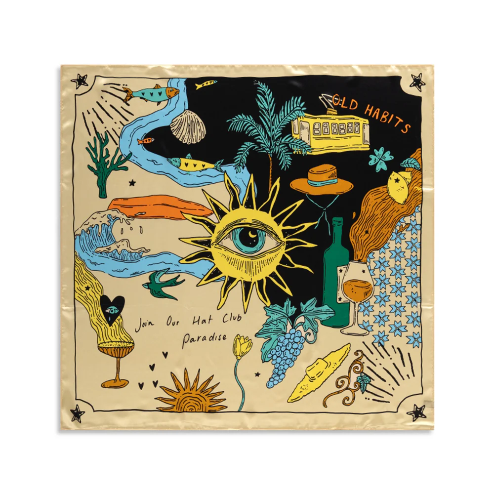 Das Old Habits Die Hard Bandana The Story Of ist ein Seidentuch, das die erfüllte portugiesische Kultur und Lebensart repräsentiert. Ein Design, das ein kulturelles Leben würdigt – voller Kunst, Musik und Kulinarik gemeinsam mit Menschen, die wir lieben.