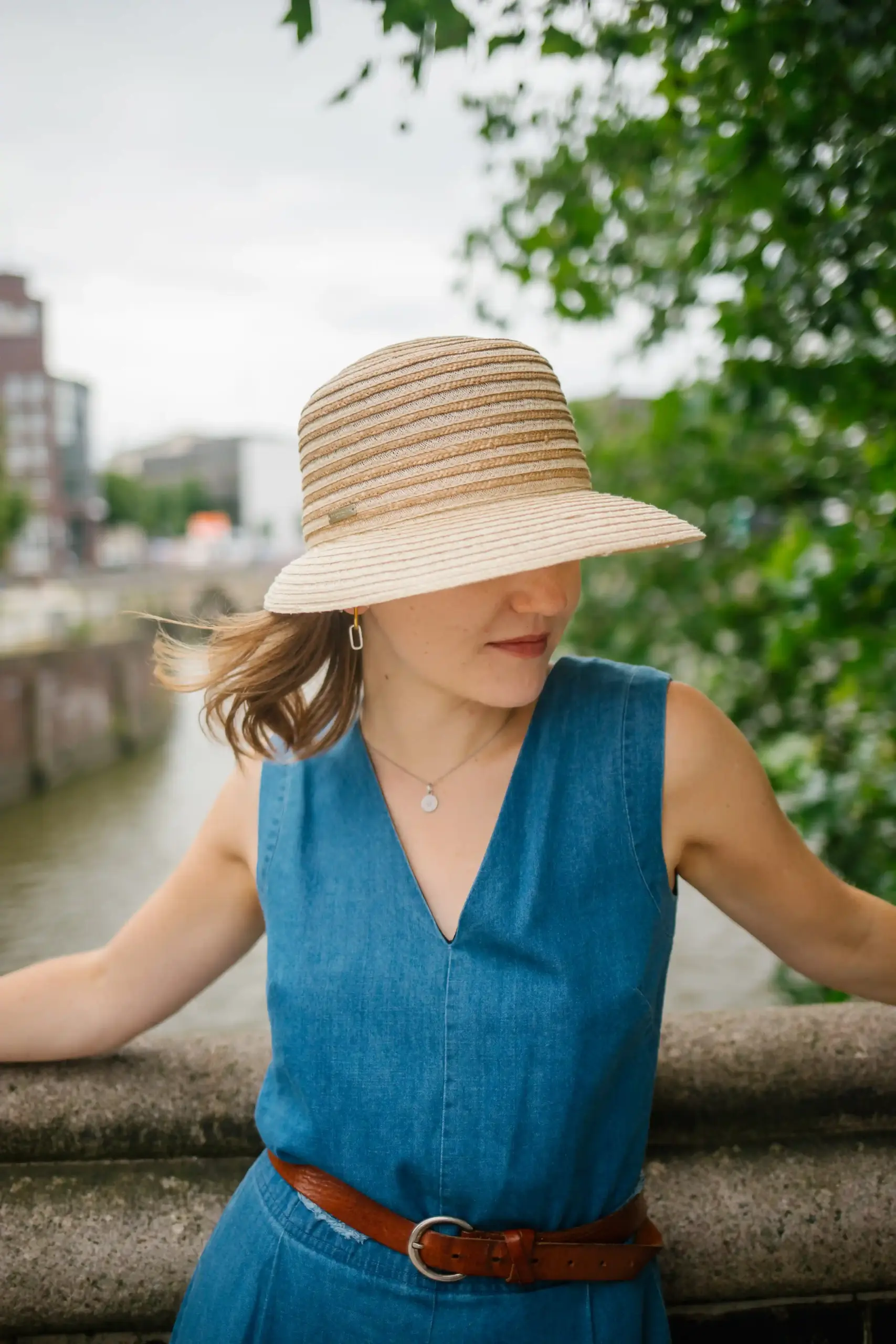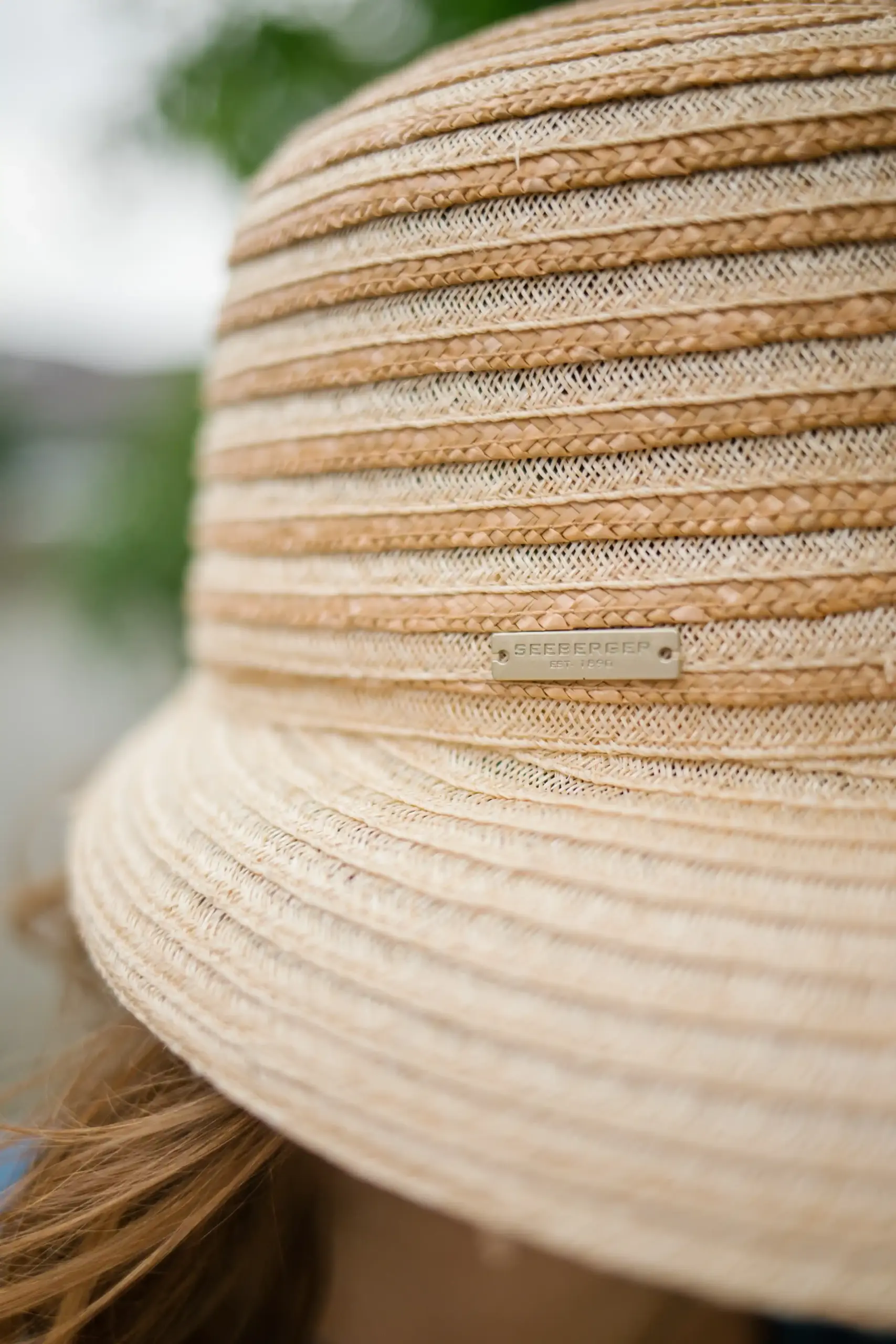 Seeberger Schute aus Naturstrohmix. Im Kopfbereich wurde das Material zu einem Streifenmuster verarbeitet und zeigt so einen besonderen Look. Der Rand verbreitet sich nach vorn auf 8,5 cm und spendet so den Augen Schatten. Der Style erinnert an einen Visor. Ein angenehmes Futterband aus Stretch unterstreicht den Tragekomfort. Alles in allem also ein sehr modischer Sonnenschutz. Leichte, luftige und sommerliche Kopfbedeckung. Tolle Farbauswahl.