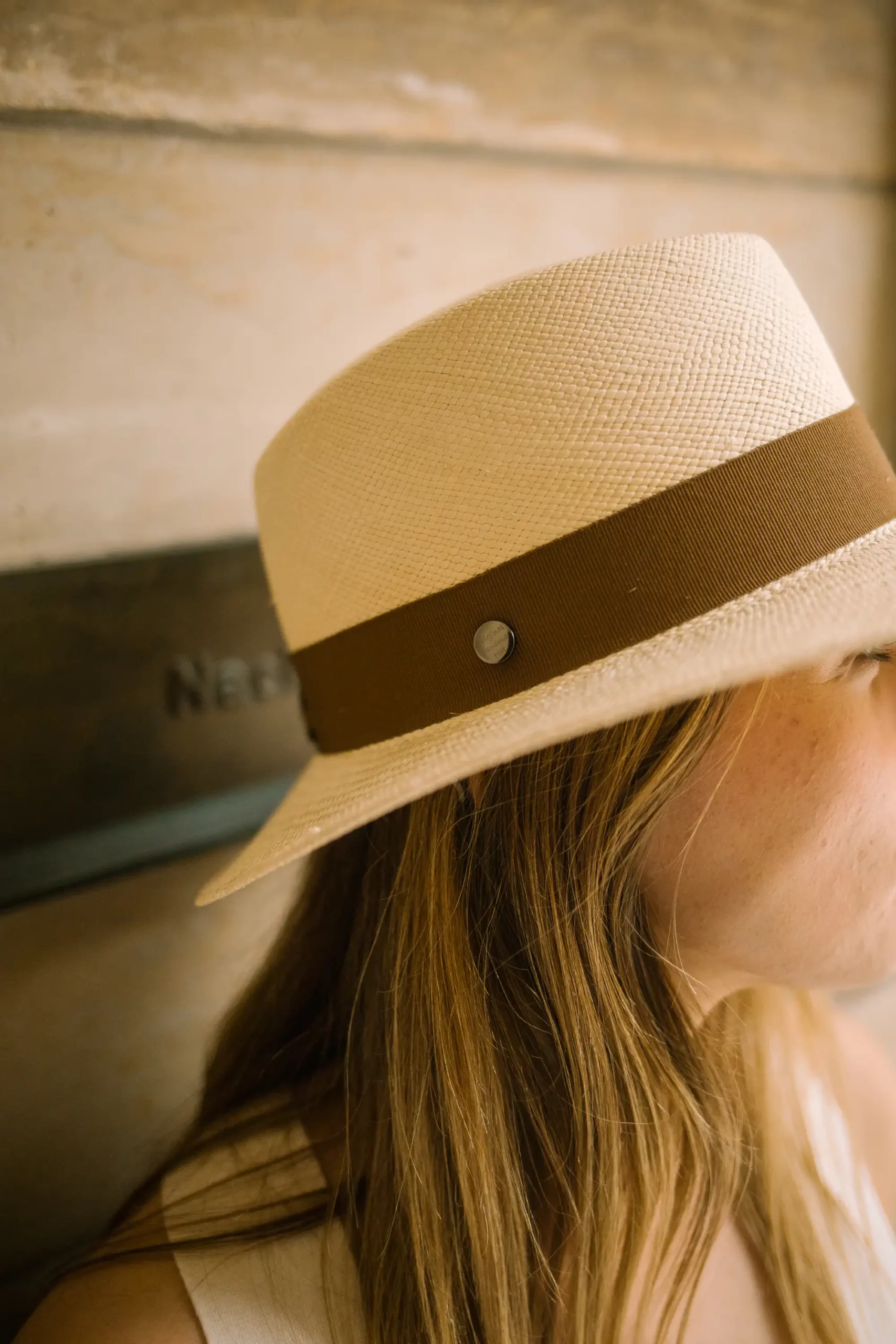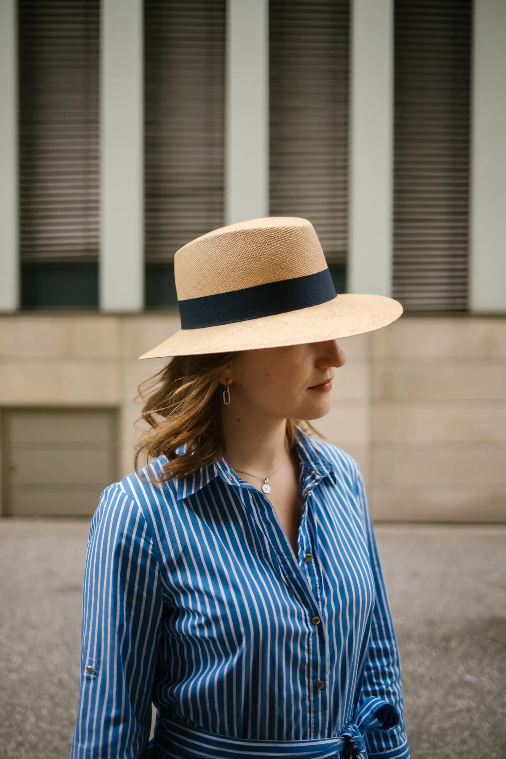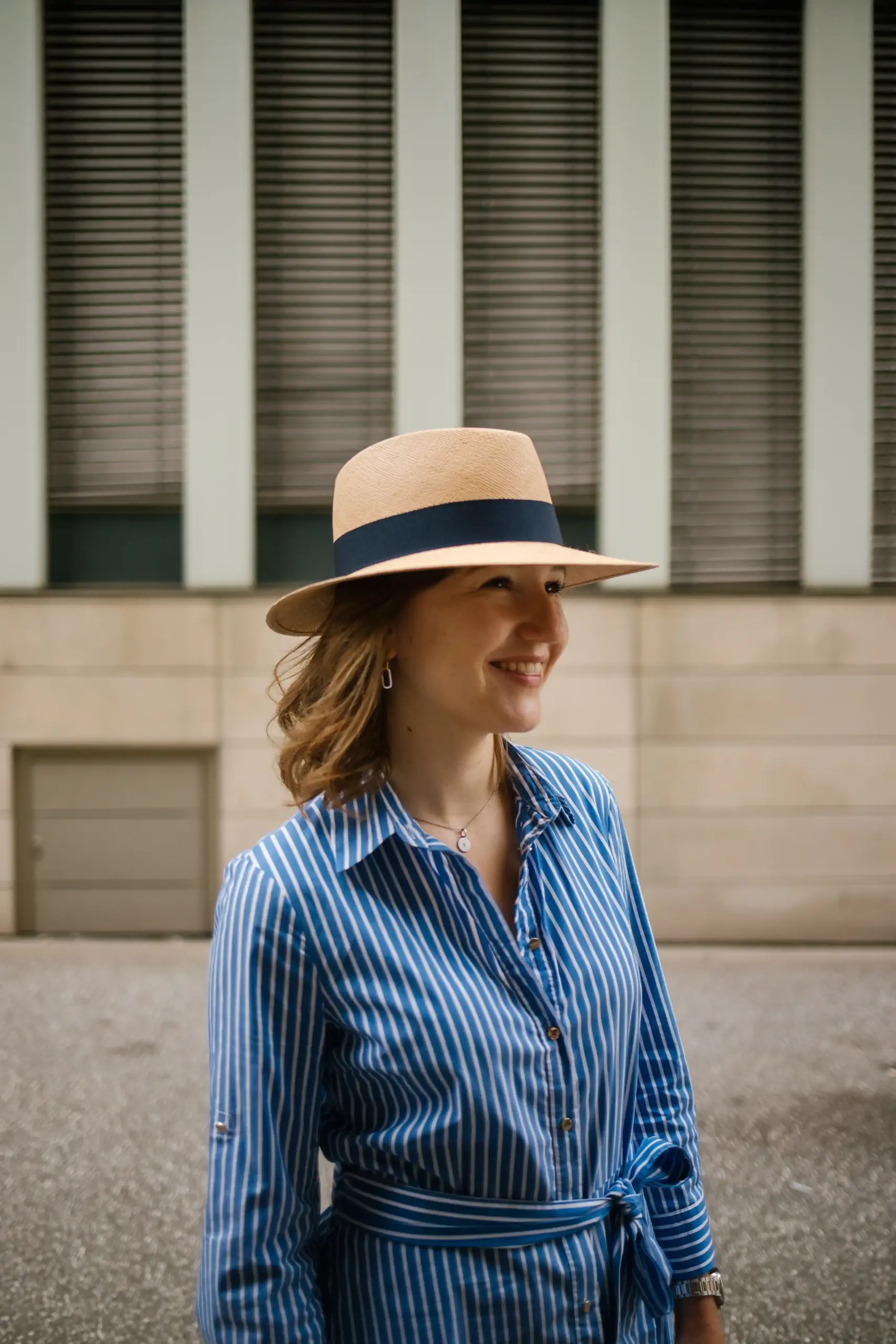 Material: 100% Stroh / Panama Stroh Farbe: Natur/Hellbraun, Hellbraun/Dunkelblau Kopfhöhe: ca. 10 cm Randbreite: ca. 6 cm